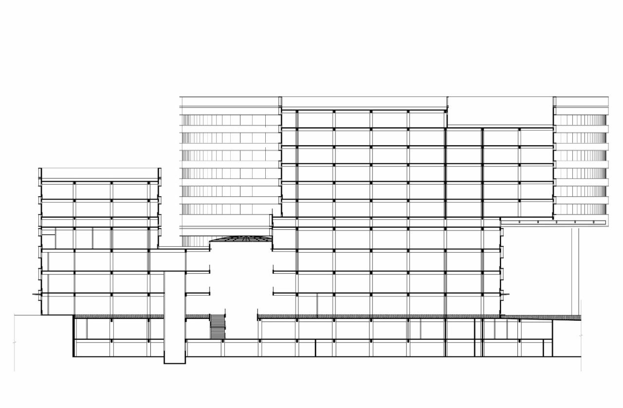 F5以上北侧为六层双病区病房,南侧为两层双病区的VIP住院病房。标准病区几乎所有的病房面朝东南向,拥有良好视野。医护用房均能自然采光通风。