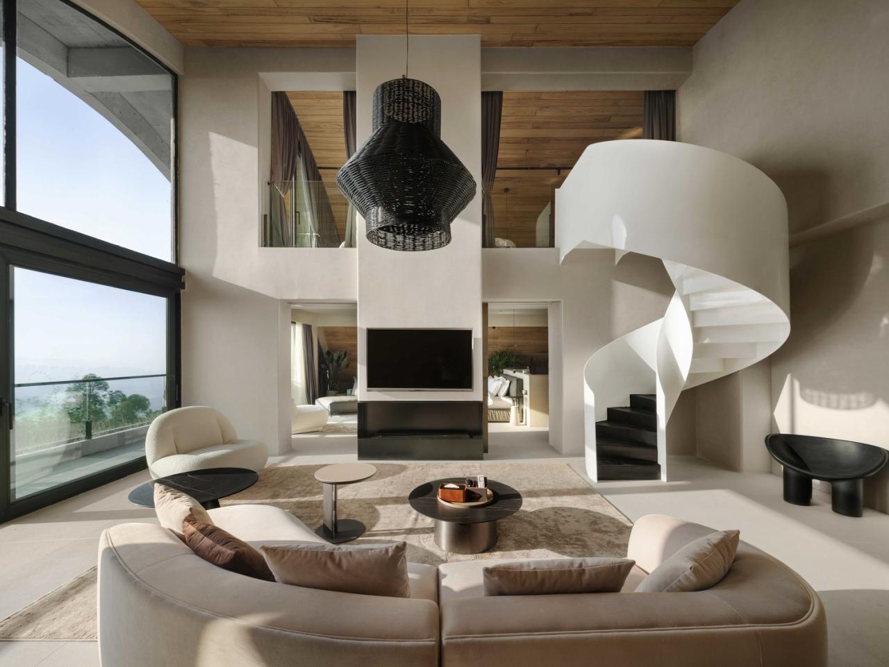 主体建筑以“麦田波浪”为设计意向,波浪型的建筑形态与玉峰山自然山地景观相映成趣,建筑成为自然场所的有机延伸,呼应着起伏的山势,表达着其与自然融合,亲近的态度。同时,起伏连续的弧形屋面将建筑体化解成了多个体块,消减了建筑庞大的体量感,有助于减少其对自然景观的尺度影响;建筑的弧形屋顶亦产生了建筑内部空间的多样变化,使得客房空间产生了新的“机会”,尤其是顶层的“拱顶”客房结合建筑造型而设计,创造了独特的度假体验感。