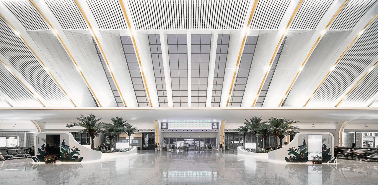 中轴对称的天花轴线,在视觉尽头形成了“孔雀开屏”的放射弧线联想,凸显西双版纳地域“灵动”元素,体现出高铁站房室内空间现代性与地方民族性的平衡。