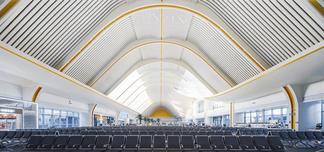 候车大厅顶部天花,以八字钢肋顺应建筑结构桁架体系,整体采用平行布置,使用简洁的梭形造型语言与建筑屋顶造型相协调,序列层次感十足。天花肋骨细部借鉴地方文化代表色系,以“版纳金”点缀其中,与建筑主色调形成内外呼应,并有打破通体白色的视觉乏味感,与照明、暖通等设备功能相契合。