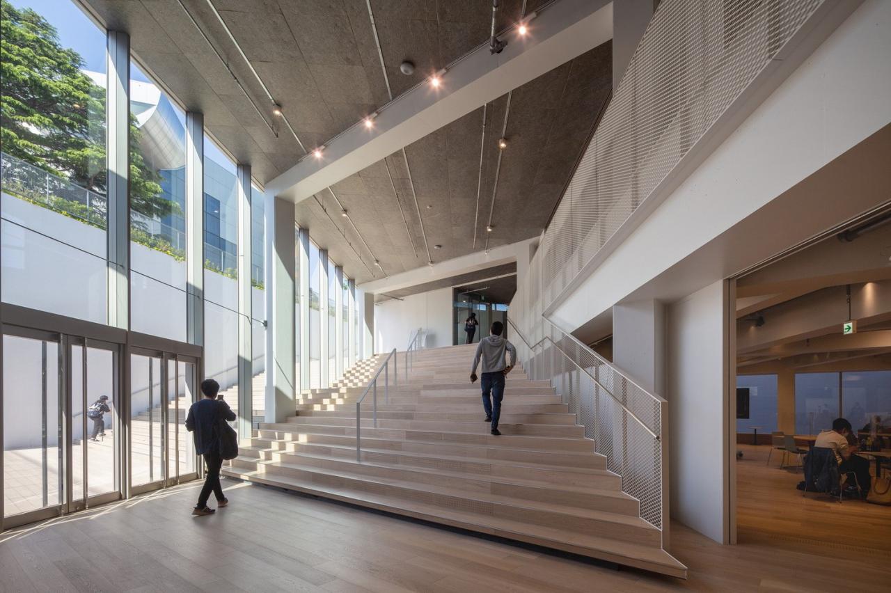 屋顶阶梯式的景观不断向周边攀爬,并延伸至建筑物之中,从而使得室内空间和外部景观之间的界限变得模糊。同时,这样的设计也让公共学习和联合研讨会等活动可以同时在不同楼层举行。此外,Hisao & Hiroko Taki广场建筑间并没有明显的空间划分,以此在视觉、触觉等方面更好地营造了观览者的感官体验。