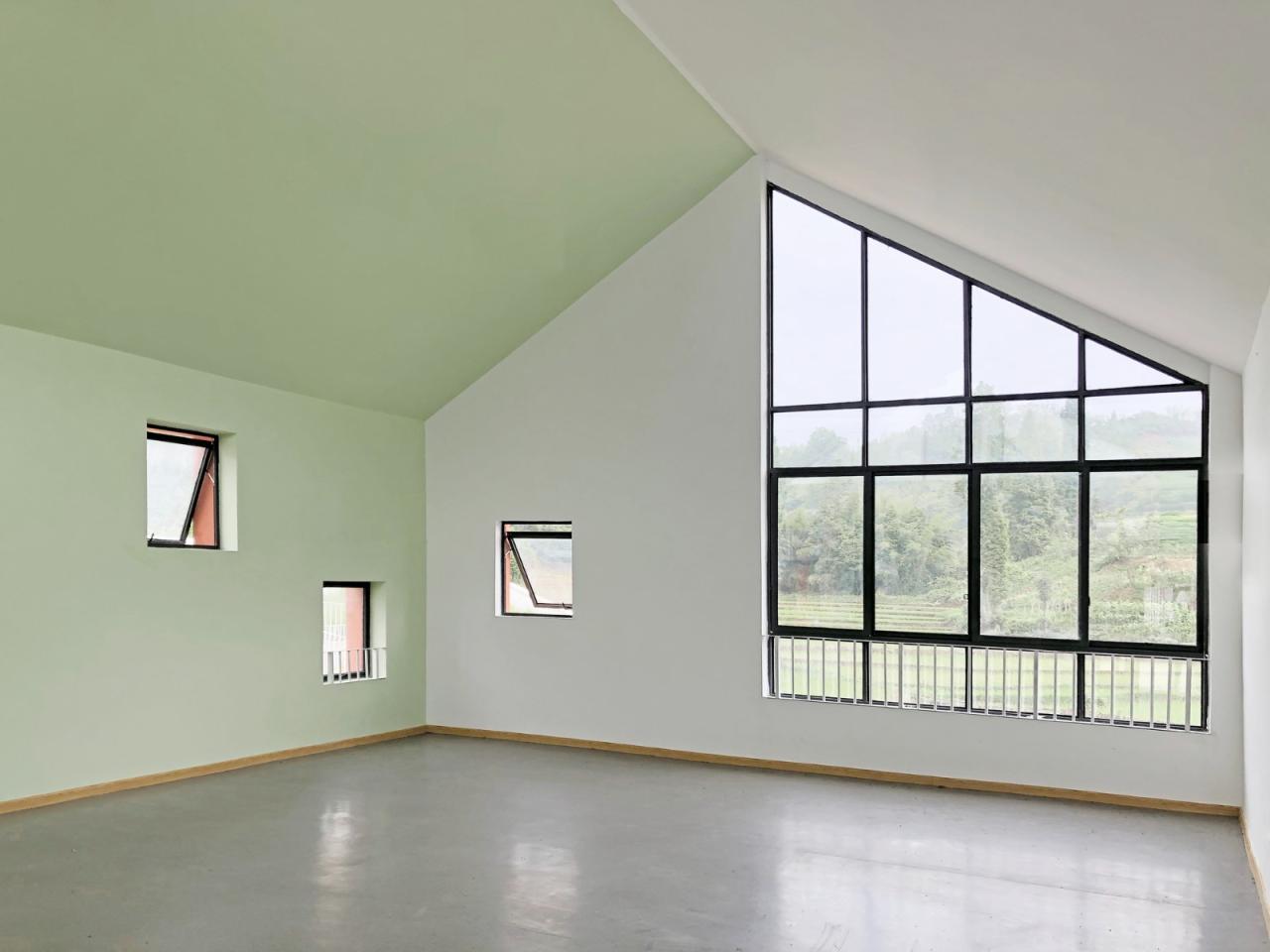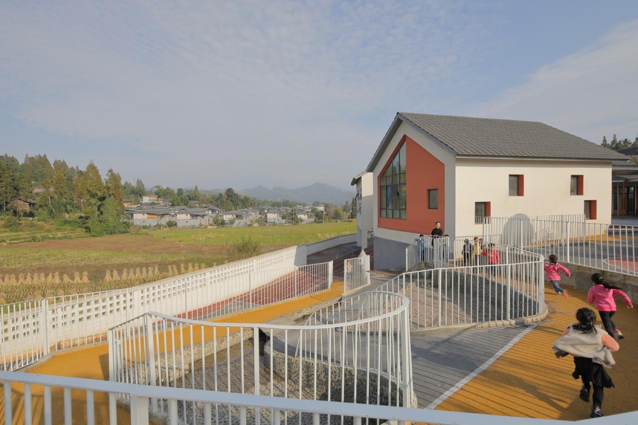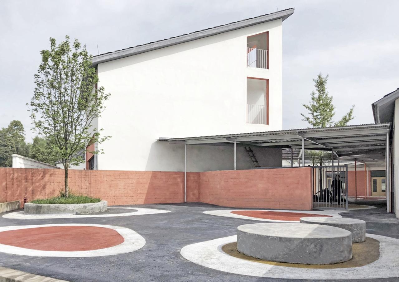 边界边界营造出分隔与交流。入口处采用饱和的砖红色围墙,沿村路筑以白色镂空围墙,和农田交界的围墙则仅为护栏高度。相融的边界便幼儿园成为儿童认识家乡文化和自然的心灵所向,也成为联结乡情、社区互动的纽带。