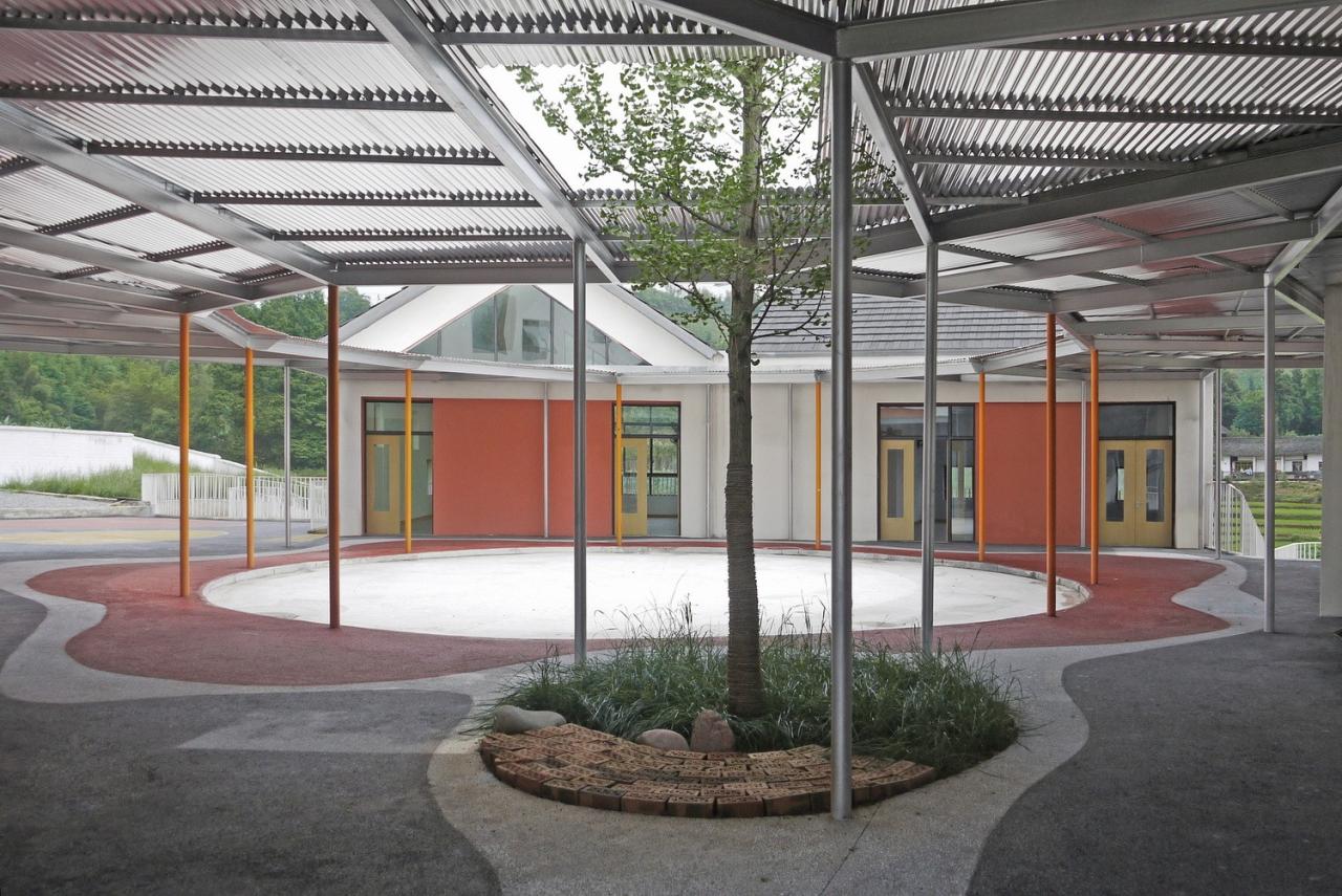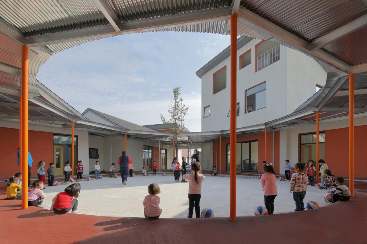 幼儿园的用地为多级台地,南北高差达4米。我们把空间分为上下两个层次,上层联系村庄,下层连接田野。
