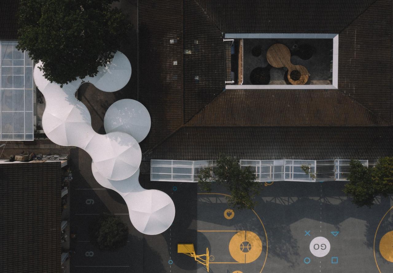 如何把握公共端⼝的尺度、延续集体记忆成为本次探索的⼀则重要议题。⼀⽅⾯,设计试图通过空间重置唤醒孩⼦对于⾃我所处环境的意识形态并产⽣真正⾃主性;另⼀⽅⾯,动态的空间状态将为场所带来活力,在有机融合中展开新旧对话。