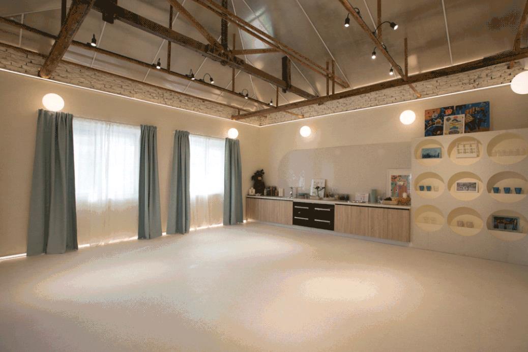 延续内外⼀致性,活动室入口中庭顶部采⽤阳光板以呼应建筑外部,产⽣暧昧关系。四周被分解的空间单元通过中庭轴线再次统⼀起来,加固的结构⽀撑⽅式则将地⾯释放于使⽤者。