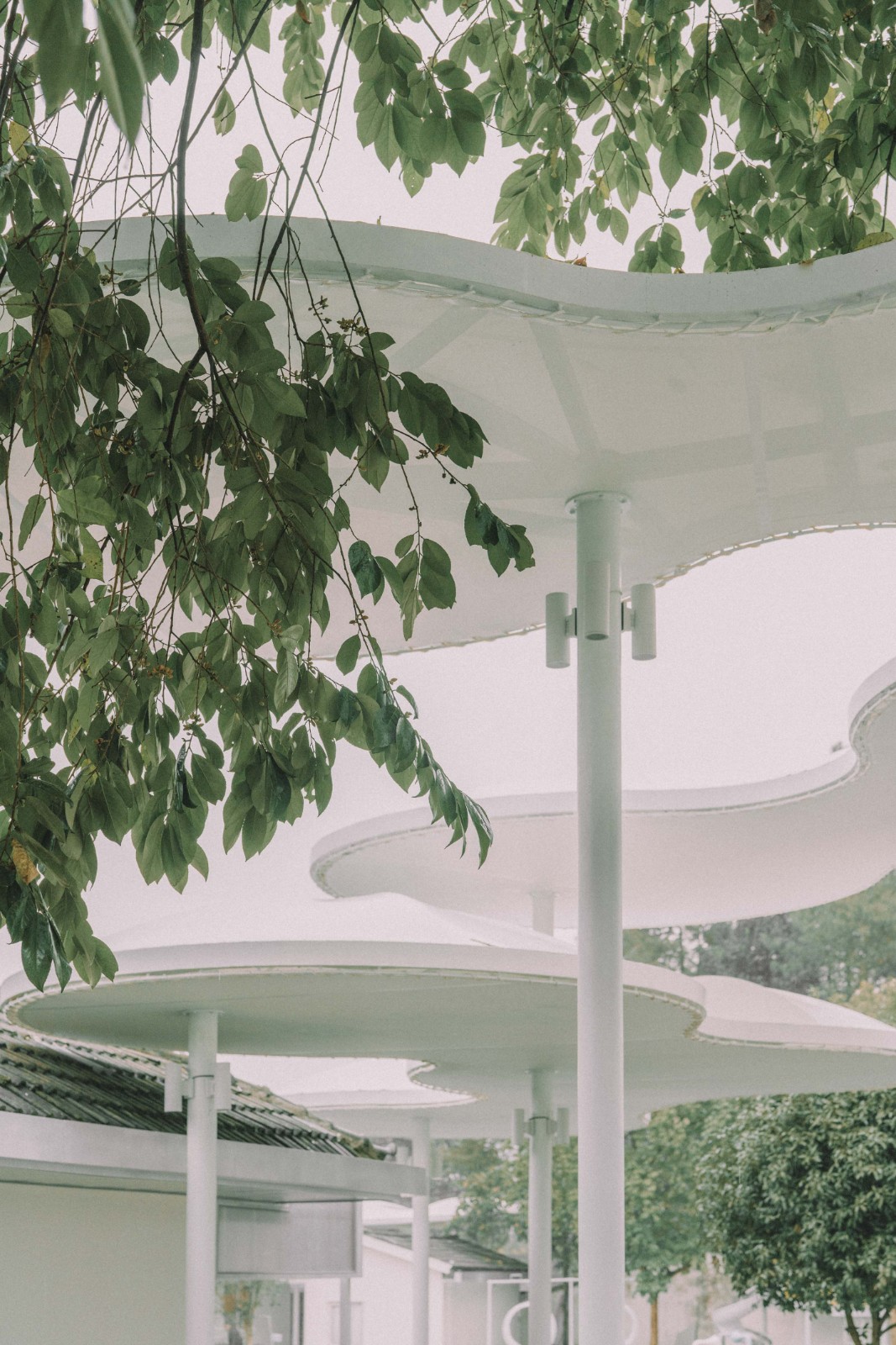 通过檐廊和⾬棚来拓展⽣活空间,同时选择易于建造的钢构+阳光板、钢构+膜的建造方式增加空间尺度与情感层次。檐廊的造型介于⼩屋和半亭之间,最简单的坡屋面源⾃孩⼦心中家的原型,完成提供庇护的家的隐喻。排列成⼀串序列的檐廊完全改变了原来建筑⽴⾯⽔平檐⼝+标准窗洞的冷漠,互相独⽴,却⼜同时形成⼀个如同群⼭起伏的整体,象征着孩⼦们⼿拉⼿的村落。云朵形态的⾬棚,如同妈妈的怀抱消融原本各不相⼲的建筑体量,⼜好似孩⼦们的嬉闹追逐,串联起整个场地的建筑与⾃然。尊重⼀草⼀⽊,给予平等的关怀,在情感安顿之后仿佛⼜回想起第⼀次驱⻋进⼊北川的那⼀天,眼前那延绵起伏的⼭与⼭间漂浮的云。