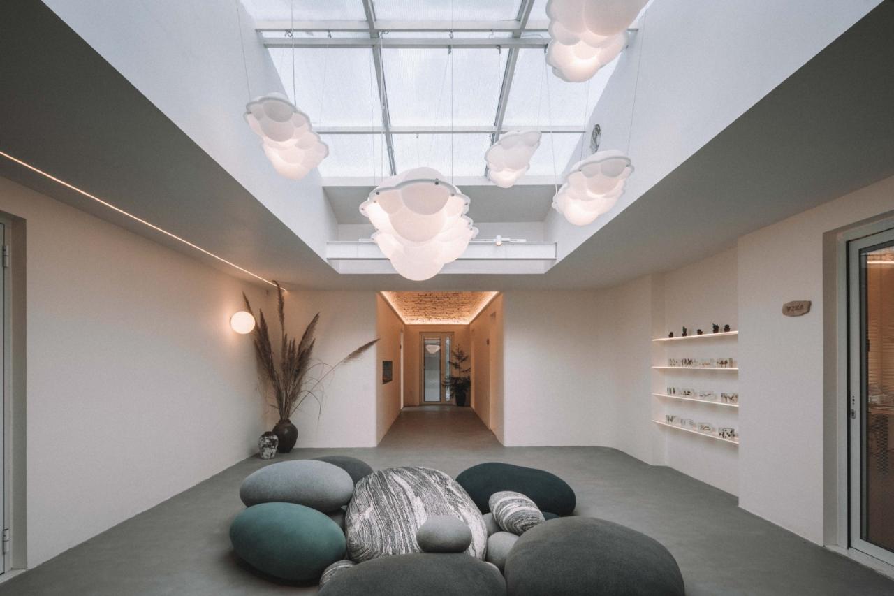 建筑内部空间与⼤环境相连接,每个空间都有与⾃⼰“独处”的界⾯,整个外场因⽽成为家的会客厅,在介于私密与公共的层次与体量中,包裹并从容接纳着每⼀个深⼊其中的访者。
