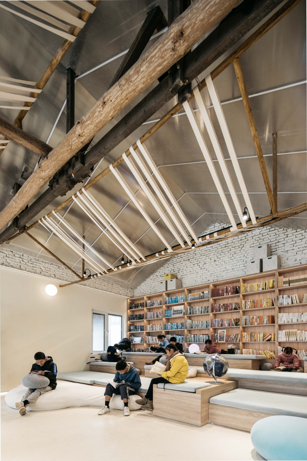 原有单⼀的阅读区被重塑成多元的复合型空间,兼具阅读、储藏、举办⼩型活动等功能。阶梯式的阅读景观延续公共空间的视觉联系,同时让孩⼦们可以寻找到属于⾃⼰的学习⻆落。