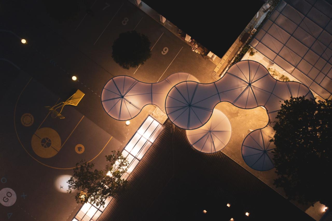 宿舍与会客厅间设有⼀个联通的内庭院落,在增加室外活动趣味性的同时提振了建筑的视觉性。通过搭建帐篷打造出梦幻的想象天地,⻔前⼀侧的暖灯则氤氲着温暖的场域氛围,为步⼊会客厅温柔的建筑腔体埋下伏笔。