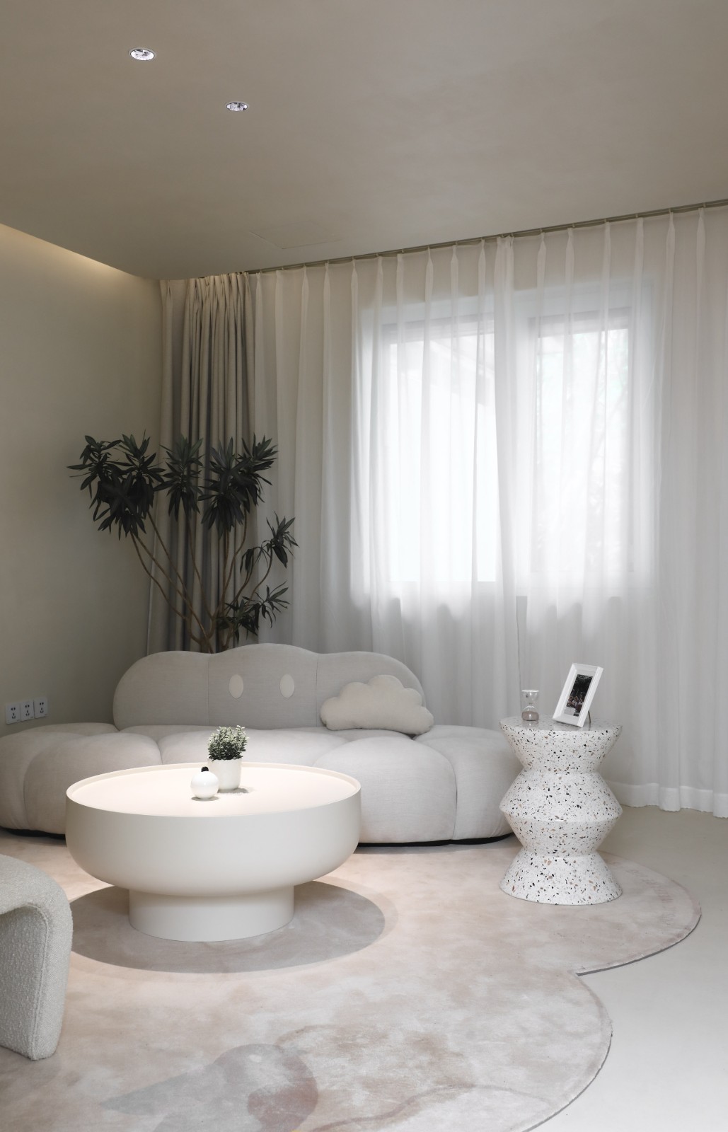 椭圆形下沉区采⽤软包堆叠覆盖的形式,创造性为孩⼦们构筑⼀个柔软的“⼩窝”。电视墙则后退式隐匿于⽚墙之中,搭配动态升降装置以“动态+科技+艺术”⼿法营造多维展示空间。