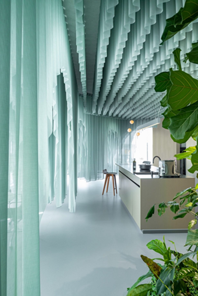 这是为Siersema Interieur(一家专门研究织物的工作室)设计的。超越空间工作室从附近的IJ河形成了这个荷兰办公室的设计构想。超越空间工作室在室内使用了一公里长的半透明织物,创造出一种模仿水运动的涟漪效果的窗帘。