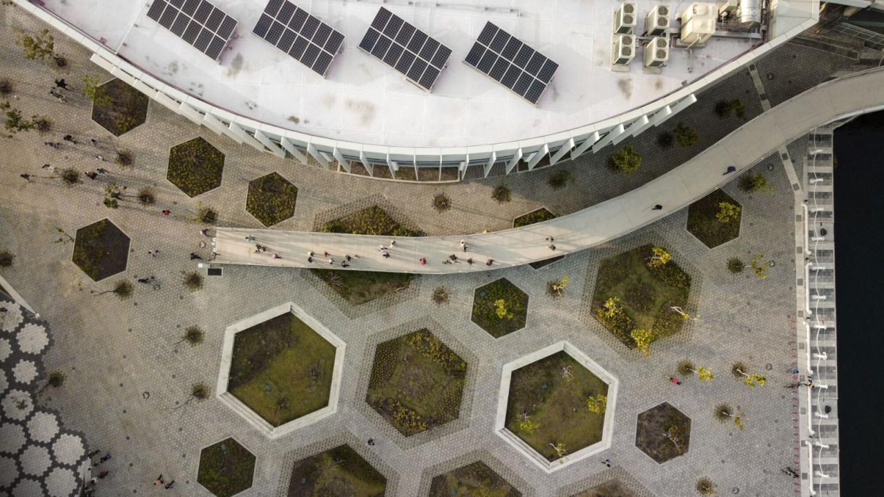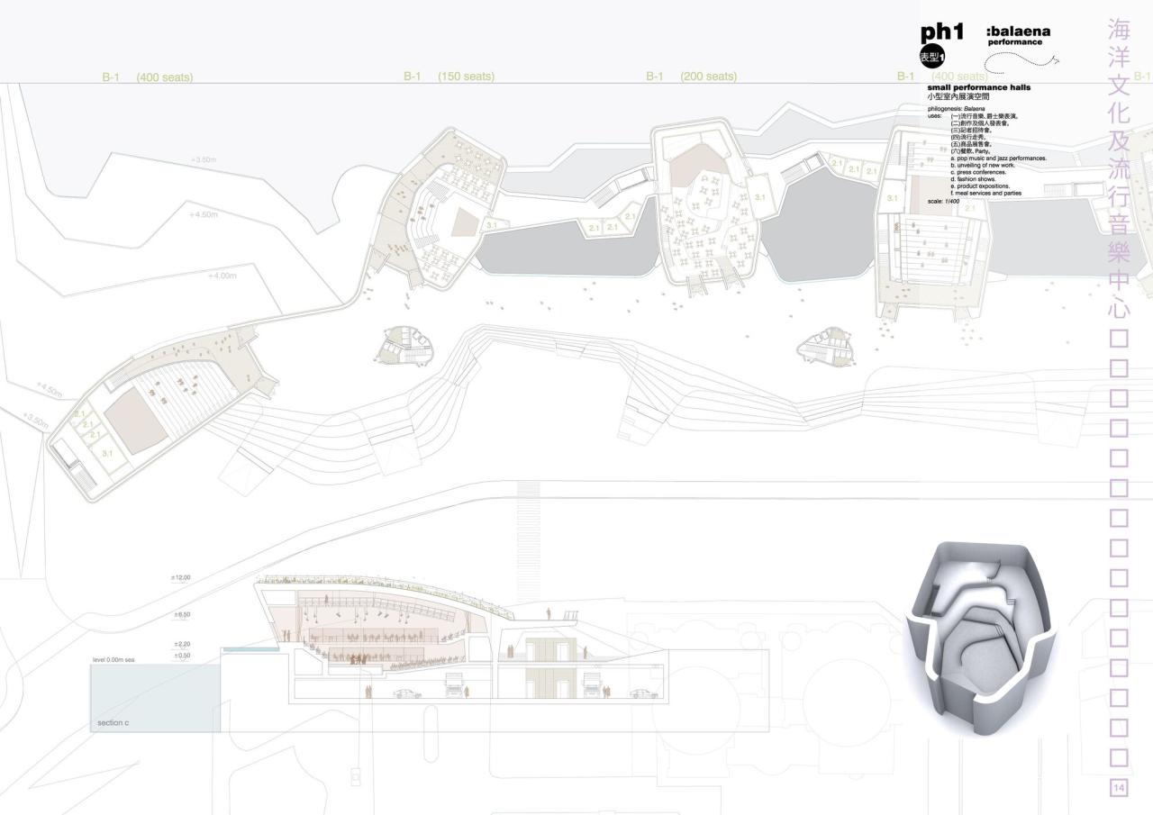 构成高雄流行音乐中心的建筑生态系统是:1.大波浪,有一个可容纳12000人的室外礼堂,一个可容纳3500人的音乐厅,以及两座带有办公项目、博物馆和排练室的塔。2. 鲸鱼号,有六座用于举办活动、音乐会或演讲的现场屋。 3. 海豚,五个餐厅,由一条走道连接。4. 珊瑚或展览,一个展览中心和户外多功能区。5. 一系列的公园和步行道连接着整个干预。