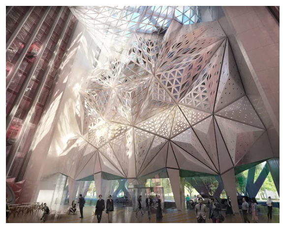 塔的设计结合了戏剧性的公共空间和宽敞的客房,以及创新的工程和形式的凝聚力。基地的矩形轮廓被挤压成一个整体,一系列的空隙贯穿塔的中心,定义了酒店的许多内部公共空间,融合了屋顶、墙壁和天花板等传统建筑元素,以创造一个雕塑形式。塔暴露的外骨骼增强了建筑的张力。这个富有力量的外部结构优化了内部布局,并包裹了整个建筑,进一步定义了它的组成形式,并与周边环境建立关系。