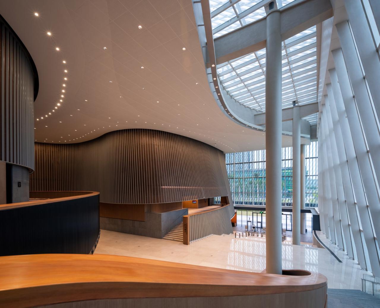 中心入口是一个楼高三层的高耸大堂,外立面的波浪形设计进一步延伸到大堂空间,除了设有巨大的弧形楼梯和木条饰面的弧形墙壁,日光也从穿孔立面照进室内,形成光影交错的动感空间。