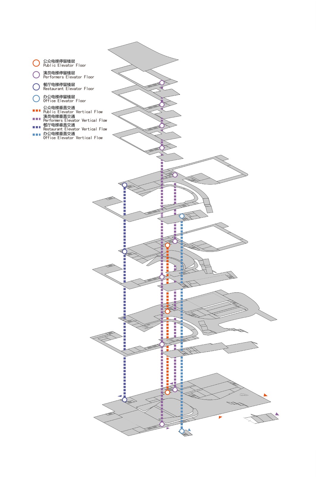 表演艺术中心的设计灵感源自紧邻海湾的狭长基地。中心的底部是一个低层建筑,其波浪形态沿园区主轴打造出节奏感和动感,外立面的细腻穿孔设计则让人联想到中国传统工艺木雕和牙雕。立面设计为中心带来闪烁的视觉效果,就像是阳光照耀下闪闪发光的大海一样。功能上,立面设计能适度调节中心不同内部空间的通透度,比如包裹大堂等公共空间的立面通透开扬,而剧场和排练空间等密闭空间则善用立面较为不透明的部分。立面设计在外观和技术上都显得创新前卫,同时也紧扣中国传统建筑概念,如屏风和影壁等元素。