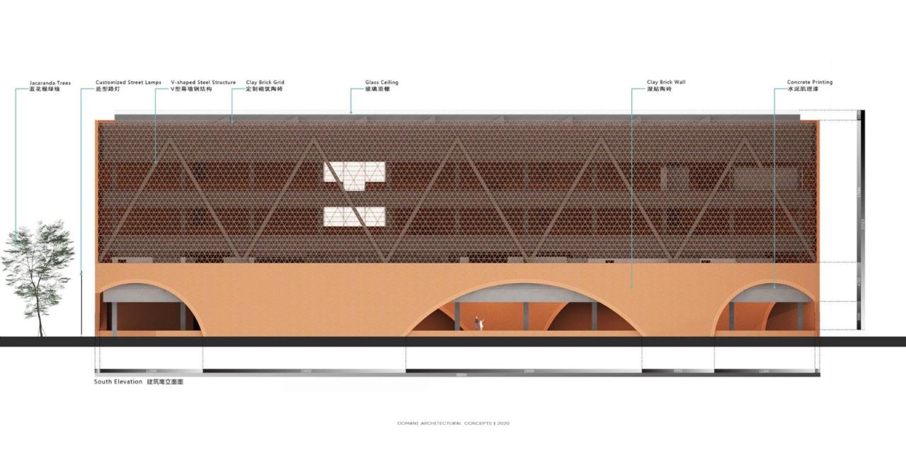 建筑整体则应用‘被动式设计’,通过东,南,西三向双层幕墙系统(陶砖网格+空腔+低辐射中空low-e钢化玻璃),最大幅度降低建筑能耗,而该系统使建筑传导热量与常规幕墙相较减少约30%,预估制冷能耗降低30%,亦有效提高幕墙隔热性能。同时,240mm侧厚镂空陶砖幕墙系统形成的日照过滤规避了东西向日照直射带来的内部炫光并保持光线在折反射过程呈递的柔和性。