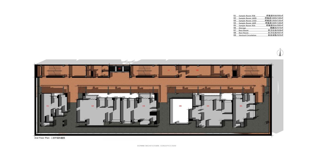 建筑中部峡谷空间基于前后两向消防分区的技术性规划而得以实现。它提供给整体建筑内部一个穿透性/互动性极强的空腔,并从功能上分置了商业展示性主楼与强功能附楼,因此释放出完整的展示性空间提供给这栋永久建筑以全生命周期的运营变化之可能。主副楼通过中空错落式梁桥进行横向动线贯穿,令人在纵向丰富的空间与光影关系中获得更意外的中空俯瞰视野。