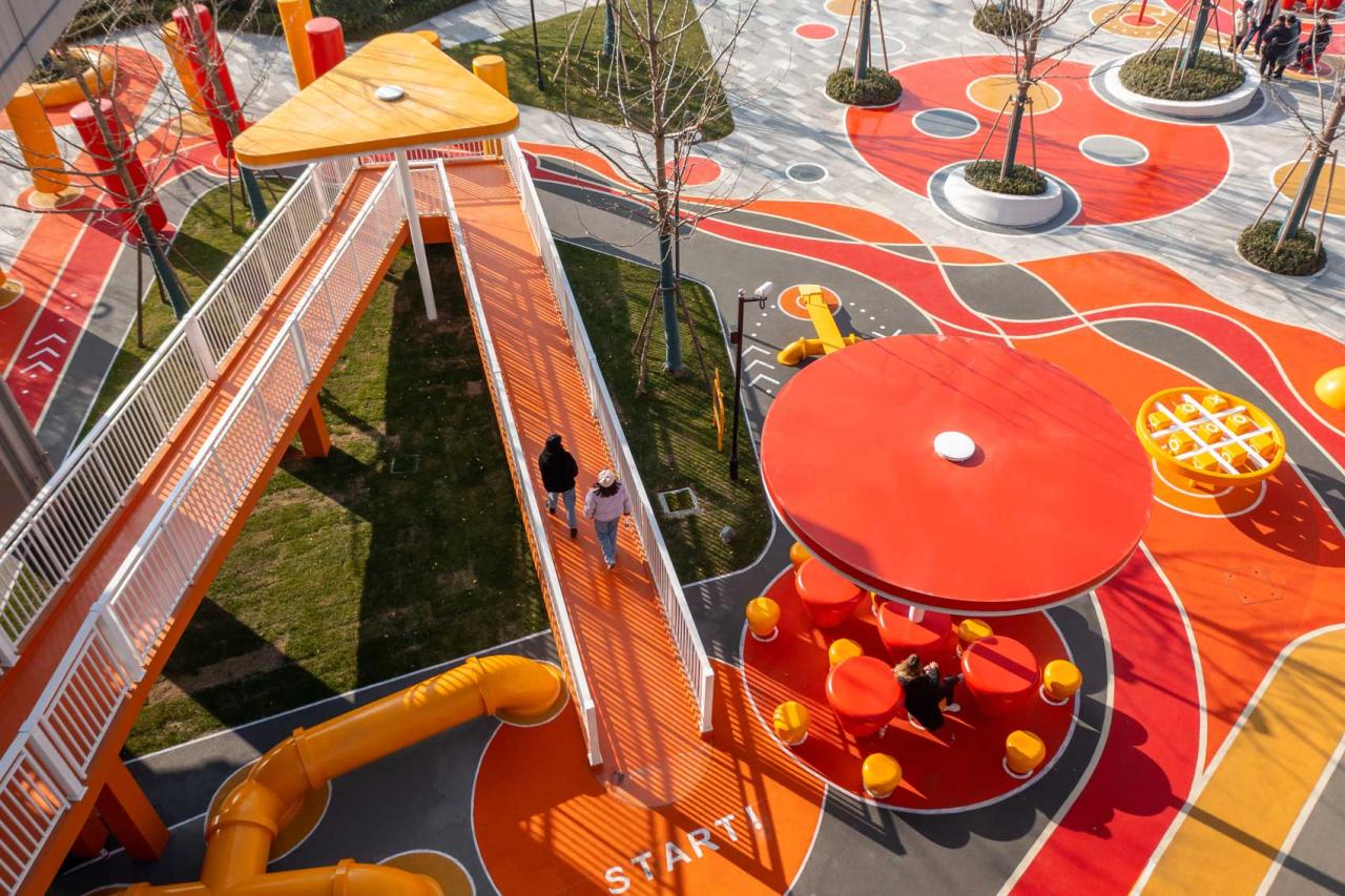 空间的其余部分继续着熔岩概念的叙事,喷发的岩浆将地面夷平并代之以鲜艳斑驳的颜色与适合儿童与成人的游乐功能,在步行路口形成了一个非常引人注目的多功能广场。岩浆的流动创造了一个刺激而生动的多功能空间动线。