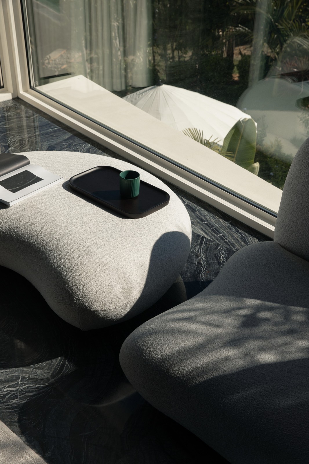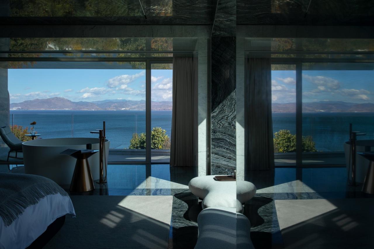 古木纹大理石有着如水墨般沉稳的自然肌理,同时光洁的石材表面映射着周边的景色光影,营造出深邃的空间体验。方形开口最大化的接纳这里愈加开阔的海景,沉淀着旅程上的所见所感。