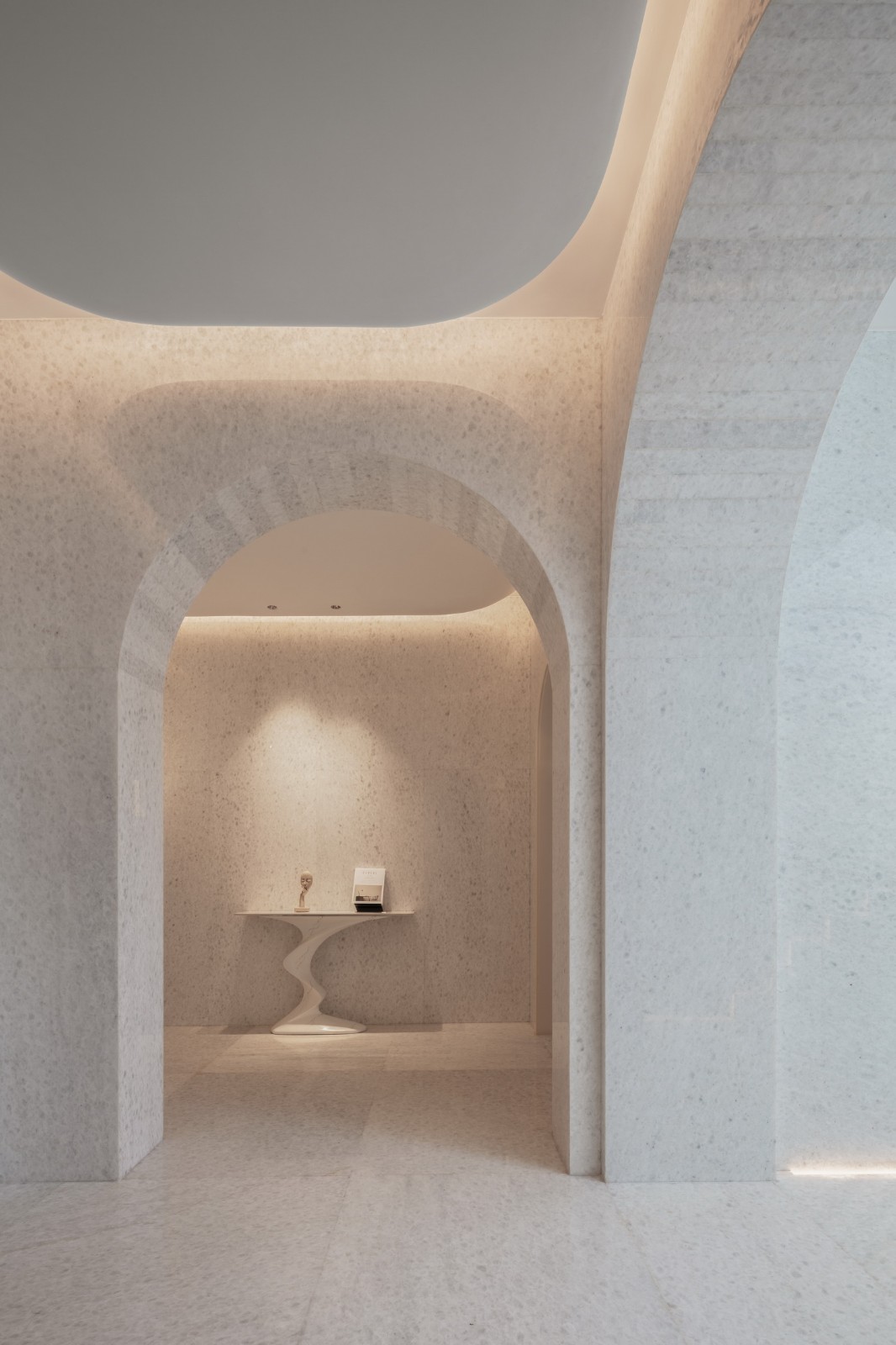 由雪花白大理石打造的楼梯间与客房入户玄关,在自然与人工光线的共同作用下呈现出米色的温润宁静,由此过渡调和就餐空间与居住空间的不同空间体验。