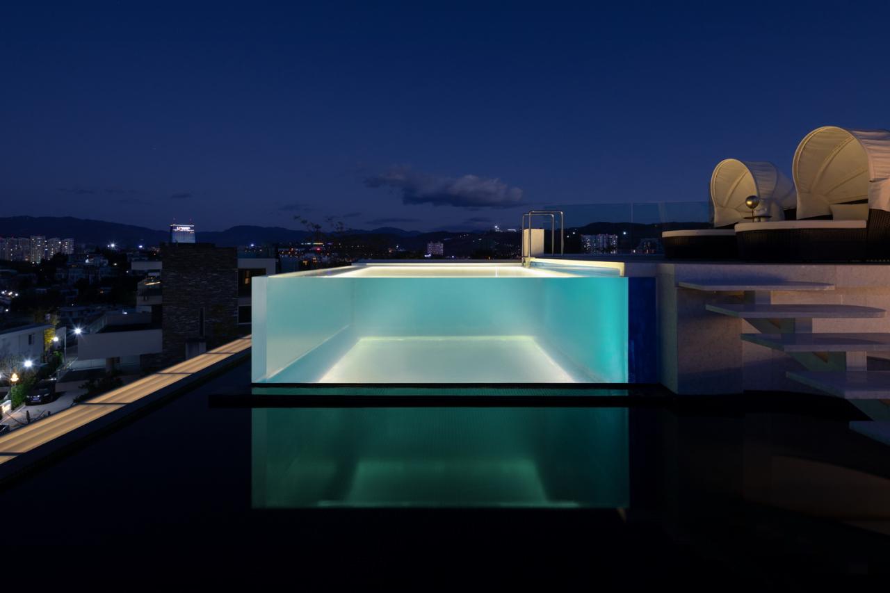 顶层以及天台作为一个独立的大套房,客厅、餐厅、卧室、玻璃泳池和景观天台一起构成了一个与天空最接近的度假空间。阳光透过泳池折射到客房内部,光影斑驳犹如置身海中,是整首浪漫主义之歌的终章也是我们认识大理的开始。