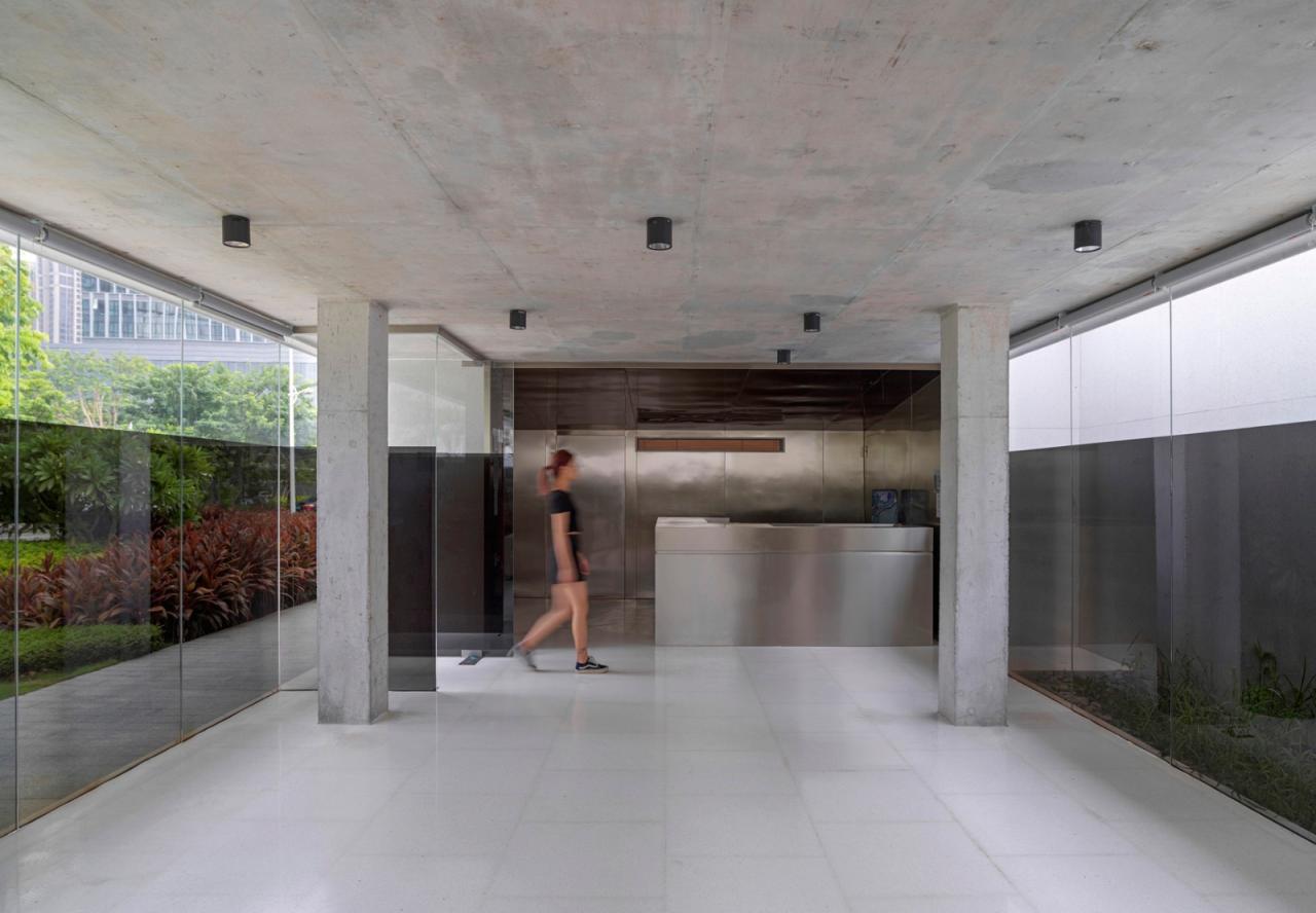 相较于外观,我们选择以素混凝土与拉丝不锈钢为主要材质介入室内空间。通过裸露在外的天花与柱、家具,洁具等,营造“沉淀”与“静谧”的空间氛围,使建筑内外能够相对脱离并形成对比,同时起到防潮的效果。当人群从喧闹溽热的户外步入室内,视觉上能够形成“降温”的效果。