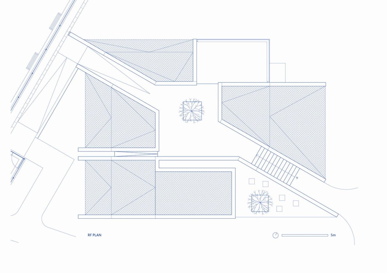 其次,沿着交叉的“十字小径”两侧分别置入了咨询厅,休息室,公共厕所和设备间等功能的四个体量,围合出小径中央过渡式的袖珍庭院。建筑为覆土形式,以拙朴之态融入体育公园的原始景观并与自然相依。