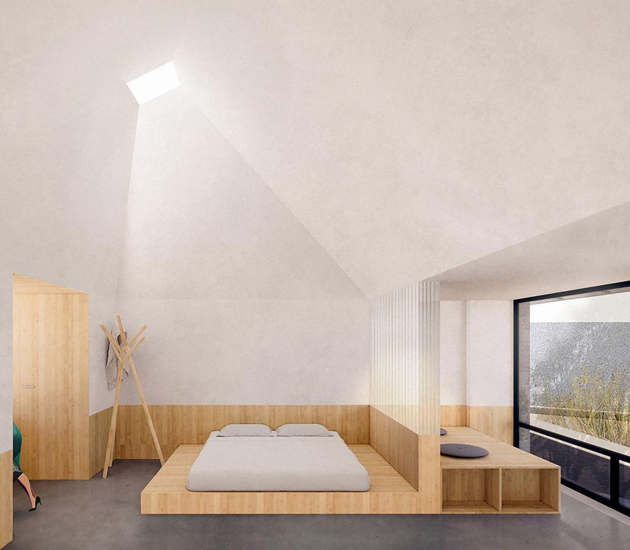 我们在每个院落的南侧置入一个朝北的“亭子”,作为起居室、以及整个院落的公共活动“锚点”。它不仅拥有北方壮丽的玉渡山景色,当折叠玻璃门扇完全打开时,“亭子”的室内空间更融入院落,穿过院落的风和阳光也毫无阻拦的进入室内。天气晴朗的时候,人们亦可登上南院“亭子”的屋顶,向南远眺延怀盆地的开阔景致。院子四周大多数墙体都被白色质感涂料覆盖。这一该地区被人们广泛使用的外墙材料让新建筑成功地隐蔽起来。