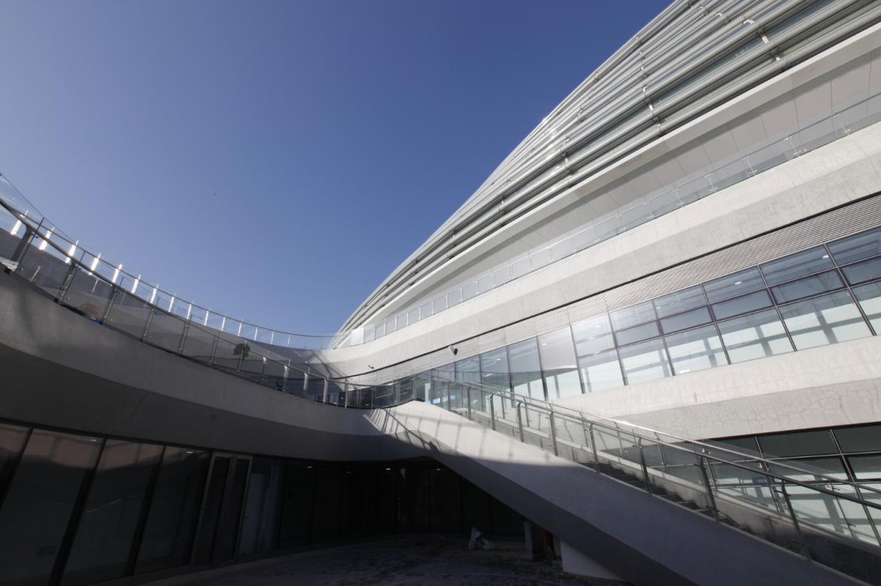 这一元素引导着设计团队大胆地将快速旋转‘冰陀螺’游戏的概念延伸、演化,从而在立面上创造了22条旋转光带。也因此,这些‘丝带’不仅仅代表了冰面和速滑赛道,同时也完美地呈现了速滑选手们的超级速度。