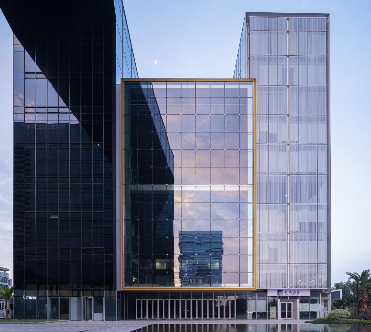 幕墙作为能否体现建筑整体性语言的关键要素之一,混杂的手法并不能带来观感的整洁性。为区别于周边相近的建筑面目,设计以尽量少的元素体现立面的统一语言,仅选择三种玻璃材质:深色玻璃、焗油玻璃和超白玻璃运用于幕墙表皮。