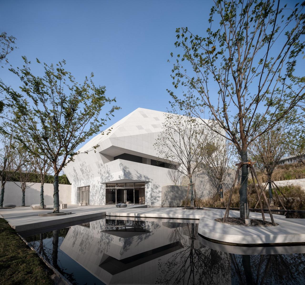 美术馆的形式是发乎于自然的。以原石造型为启发,白与灰为基本色调,形成自然、纯净、融合的视觉感受。朝向城市一侧的立面显得整洁干净,成为新地标的同时不显突兀;朝向内景的一侧则与几何形态的公园景观相融合,形成互动的空间。人与自然的交互、人与人的交流。