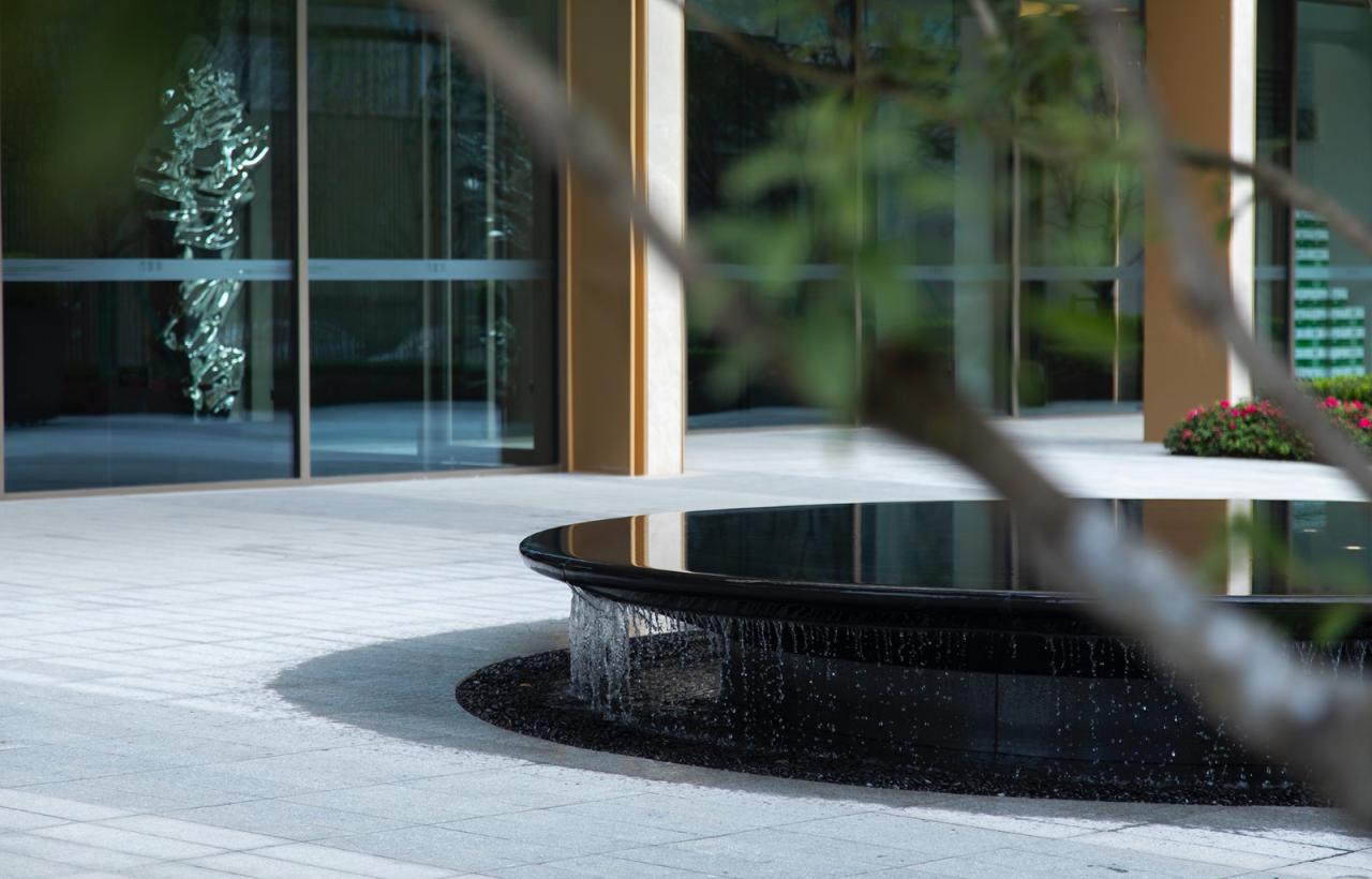 进入主入口大堂前建筑采用了大跨度方形重檐的符号,恢宏大气,景观以极简的圆形石材镜面水钵作为呼应,亦虚亦实,方圆之间,传递东方之道。