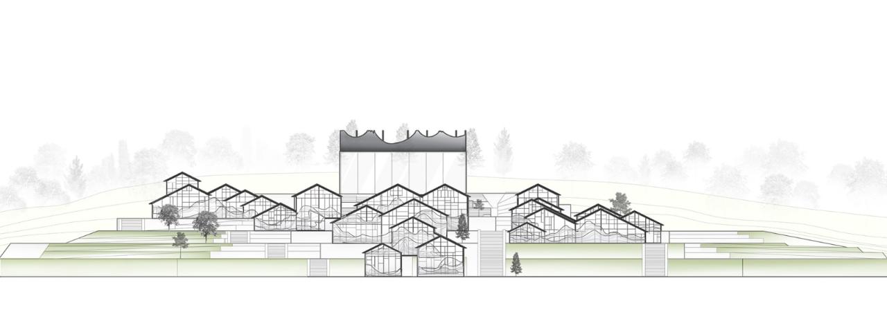 受当地群山环绕的意向启发,在建筑外立面上通过彩虹山形玻璃来再现其山之连绵。由南而北望向整个建筑群,不同建筑立面上山形玻璃会相连在一起,与后山形成呼应,营造群山连绵的视错觉。