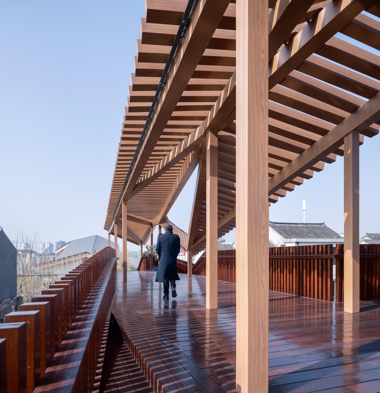 概念上与“折“一样都是提取古镇坡屋顶的肌理,通过设计尝试把不同坡屋顶的屋脊作为一个连续变化的元素,通过60米长的桥体依次排列这种逐渐变化的状态,形成一条蜿蜒的曲廊。曲廊由脊线变化产生的木格栅的疏密变化,远眺古朴厚重,近人尺度通透。桥体部分保留原有桥的混凝土结构,改造新建部分为钢结构+防腐木格栅,分段拼接优化以适应现场快速建造以及成本控制。