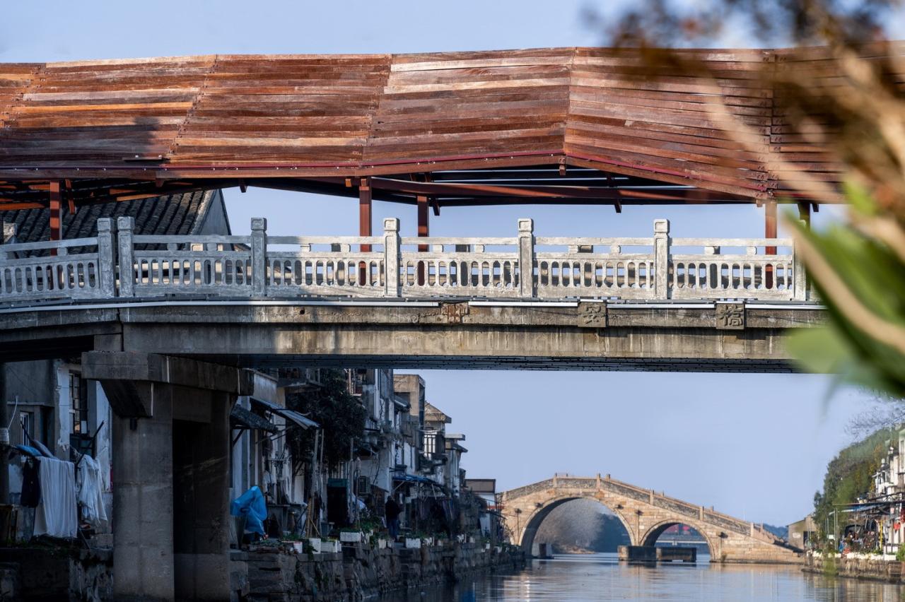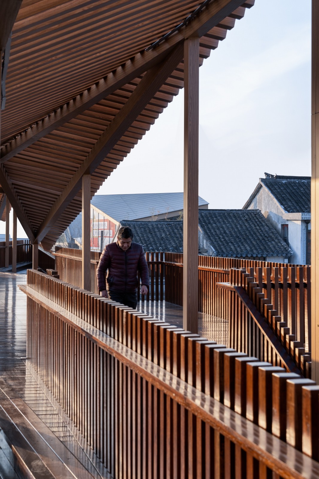 曲场景:古老的万安桥上,三几老友并排而行,摩托车突突突的穿过,绵长的线条,古朴的木头和混凝土给通勤带来了不一样的体验,也给古镇标记了一处标志性通廊。“曲”为万安桥,是一座历史桥梁,用改造的方式介入,桥体全长60米。