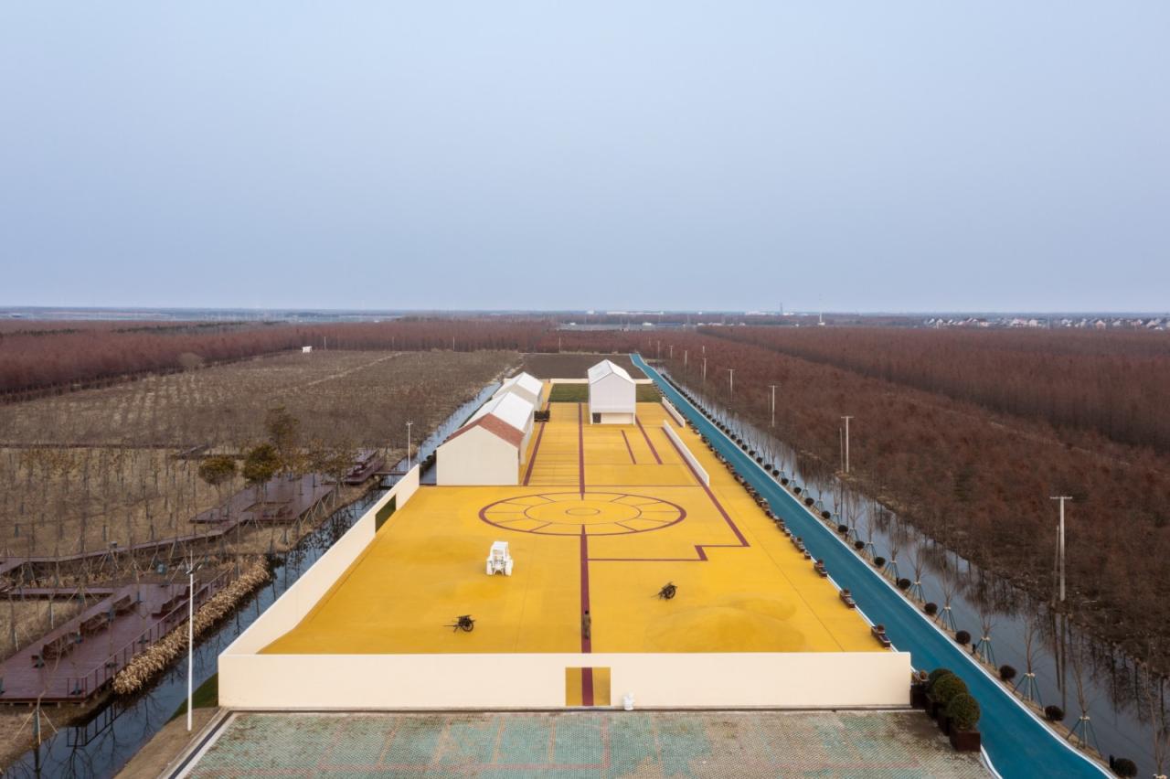 所以我决定直接用金黄色象征铺满收成的晒谷场,永不落幕的丰收。我很简单地希望安乐乡就是个拥有“永恒的闲暇、超多的食物和可食用的建筑”的地方。那就是天堂。那时我们毫无意愿呆在农村,如今却有些羡慕农村。经过人生各种意外,可能觉得简单的快乐弥足珍贵。所以在这里的设计很简单。Wutopia Lab利用如稻谷一般金黄色透水混凝土配合暗红色线条分割形成一片永存的晒谷场景:有的划分成块状,有的呈现扇形分割,而在开阔处地形微微隆起,形成高低起伏的“谷堆”,站在上面放眼望去,仿佛一片凝固的丰收时光。