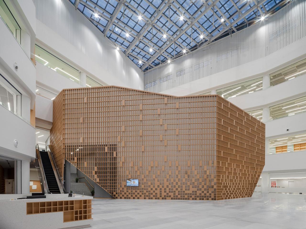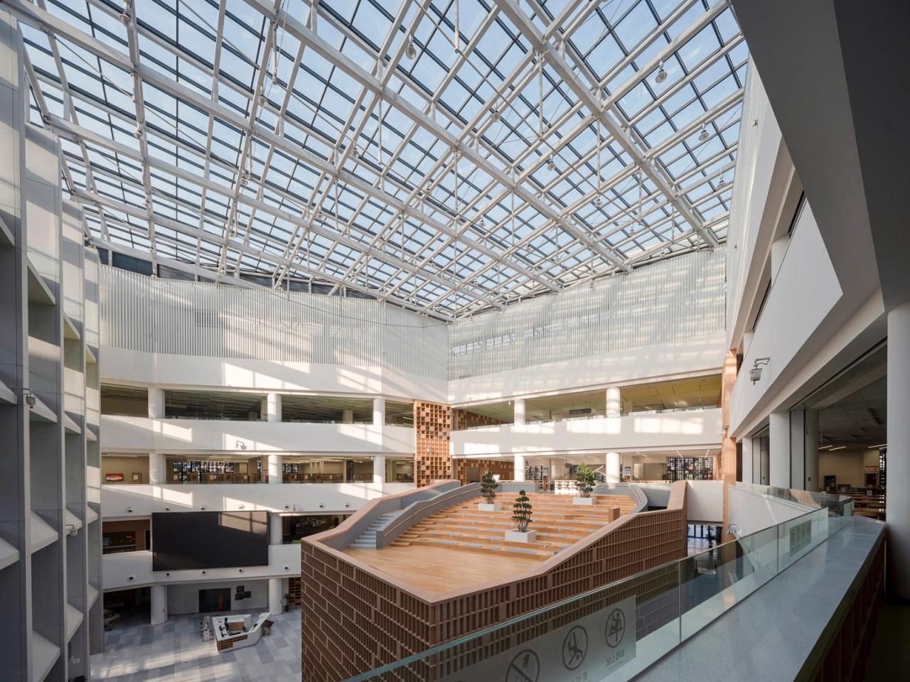建筑是人造的层叠艺术,解决受限,创造用途、情感和感觉的空间。整体建筑空间采用一体天花幕墙和中空设计,各层平台和主楼梯定义了图书馆各功能区和外观架构。