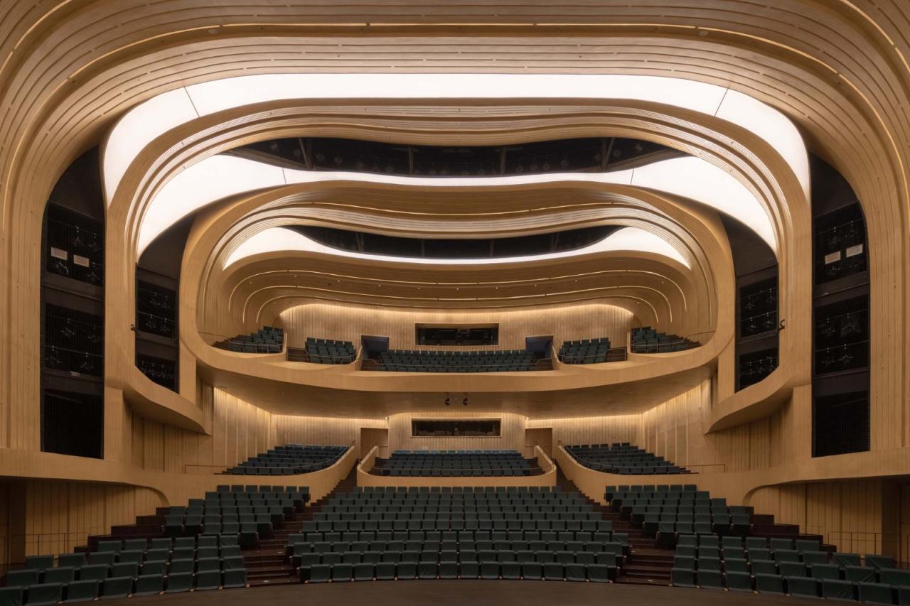 1600座歌剧厅:观众厅设计以“春江花月夜”为主题,平面呈马蹄形,采用三层台地式布局的看台如繁花绽放,一轮明月悬于天顶,呈现出云开见月明的唯美意象。照明设计实现了多样、灵活的场景化设计,烘托出丰富多彩的艺术主题效果。