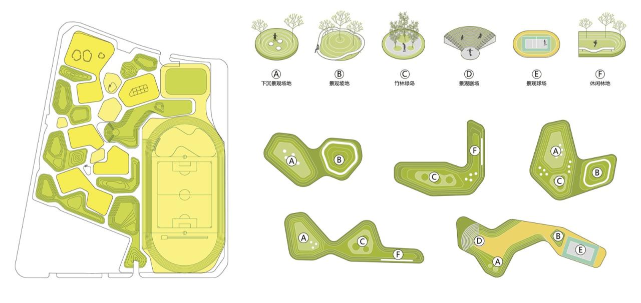 “林盘”形态的景观场地被类型化处理,形成坡、林、岛、台等景观空间,分别适用于教学楼底层架空区域和教学楼之间的下沉场地、以及与运动场结合的区域,给学生们提供晨读、课间休息和课外活动的场所。