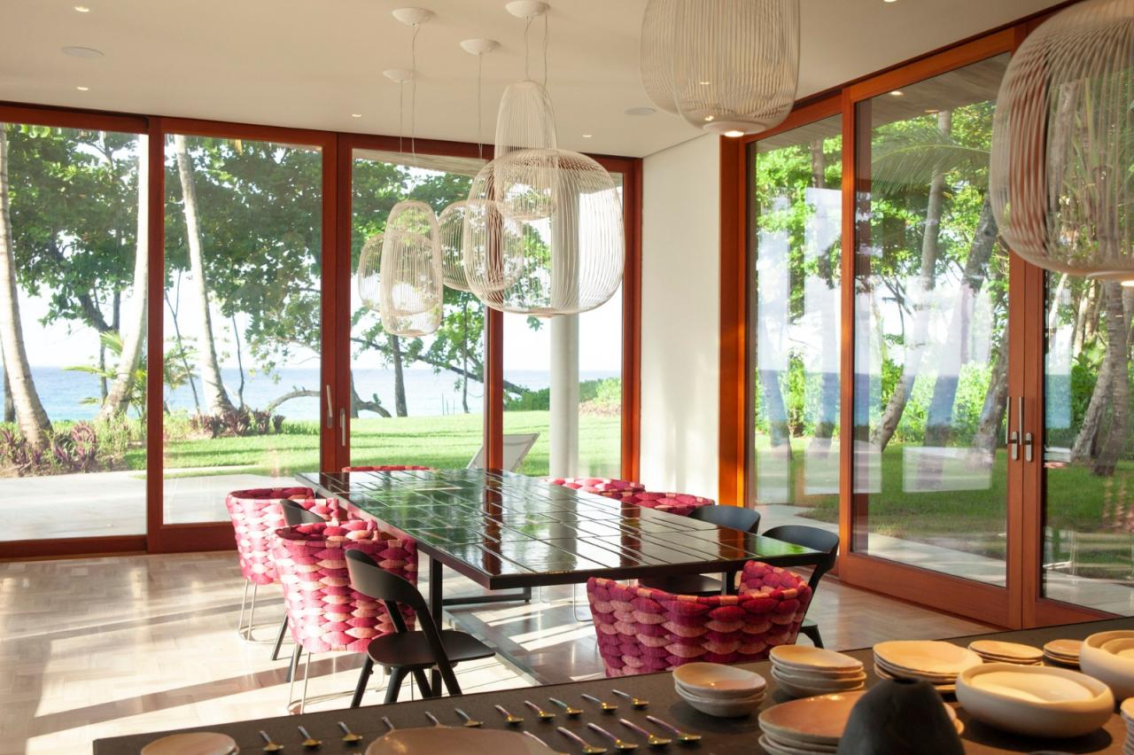 室内公共空间同样采用了庭院总体的室内 + 室外生活方式,可以打开的大门窗和广阔的露台提供了开阔的视野。厨房的设计概念是“24小时熟食店”,可以在露台或海滩上进行户外野餐。而对于更正式的用餐,可以在高高的餐厅进行,餐厅内有两张由熔岩石砖和墨绿色水晶珐琅釉制成的宝拉扁豆桌,可容纳 28 人,还有与天花板齐平的可三面打开的玻璃门,用于户外用餐。