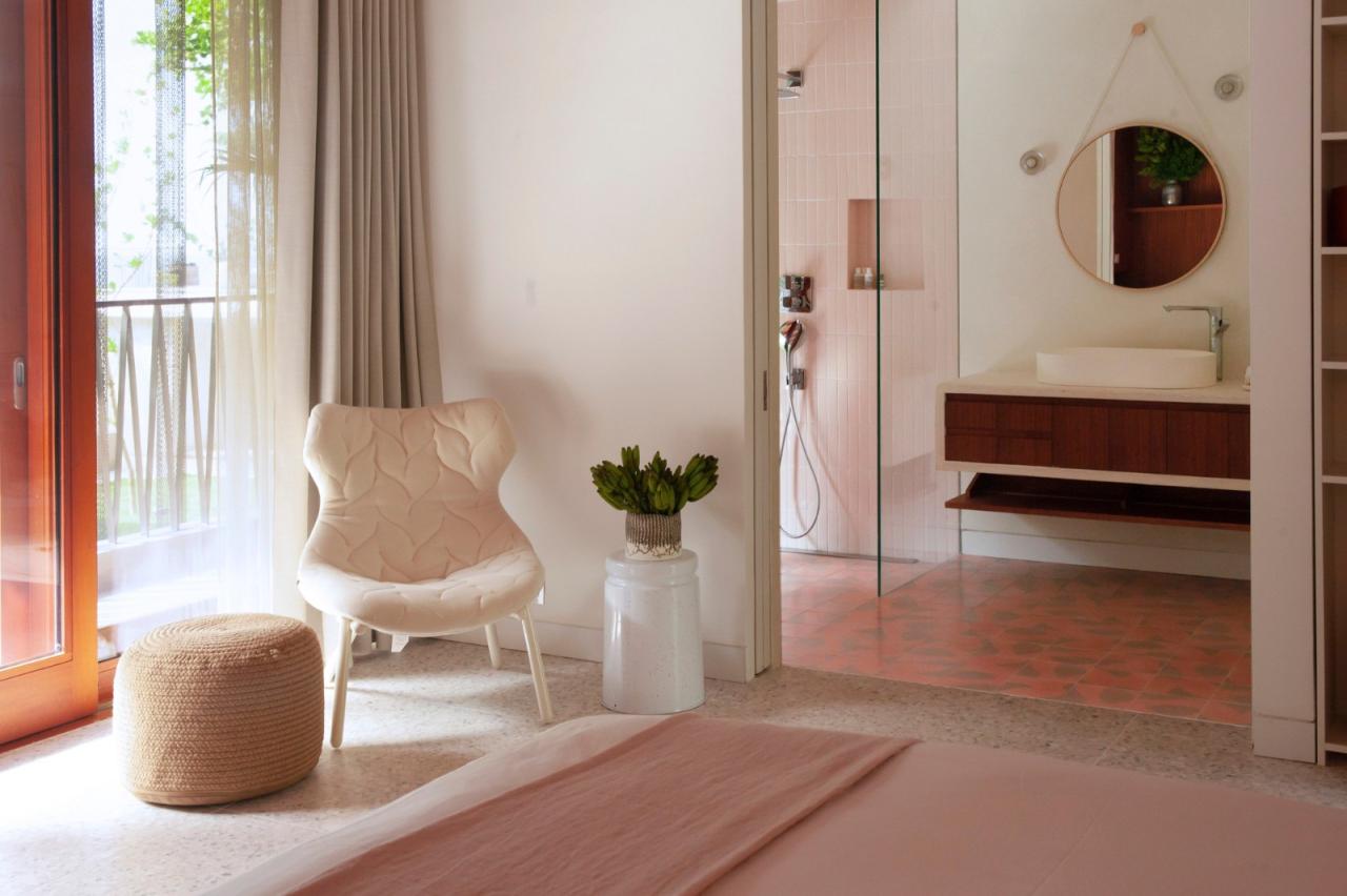 考虑到这一点,室内色调是现代且带有热带风情的,重点体现在颜色、纹理和天然木材上。一楼以饱和色调为主:客厅采用深翡翠绿色面料,餐厅在定制的黑色漆面嵌入式家具后面有一面茶色的威尼斯石膏墙,图书馆则以红木书架后的深海军蓝墙为点缀。相比之下,二楼的卧室大气又朴素。整体以中性色调和纺织品为主,藤条表面与白色雪花石膏水磨石地板相交,偶尔还会有颜色和材料的点缀。主卧采用 Hiroko Takeda 和 KWH 定制的纺织屏风,而客房套房则采用浅红色威尼斯石膏墙面。室内家具和装饰品来自多米尼加当地的设计师(Casa Alfarera, Ysabela Molini)和纽约的精品设计师(Kai Wei Hsu, Hiroko Takeda, Hollis & Morris, MVG MTNS, Egg Collective, and Chen & Kai),包括由 Colony Design 组织的多个委托项目。
