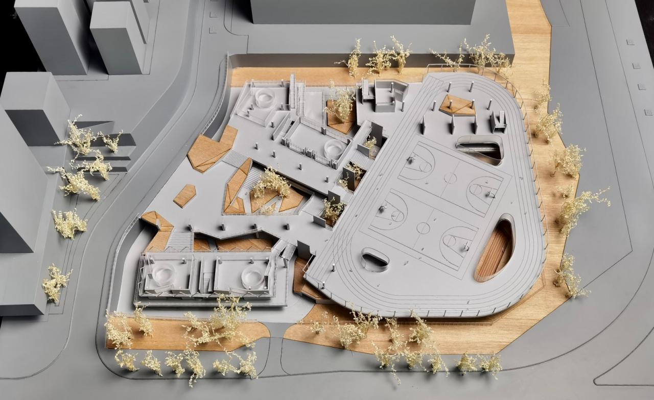 体育馆、食堂和室外运动场地分布在面对环城东路一侧,本设计延续上位城市设计中景观廊道的概念,将环城东路一侧作开放景观界面处理,也为今后学校和社区共享使用提供了可能性。体育馆的一侧与运动场地相邻,当隔断打开时,室内外场地融为一体,此外,设计中还利用了体育馆与另一侧的下沉庭院之间的2米高差,作为上下的台阶和看台使用。