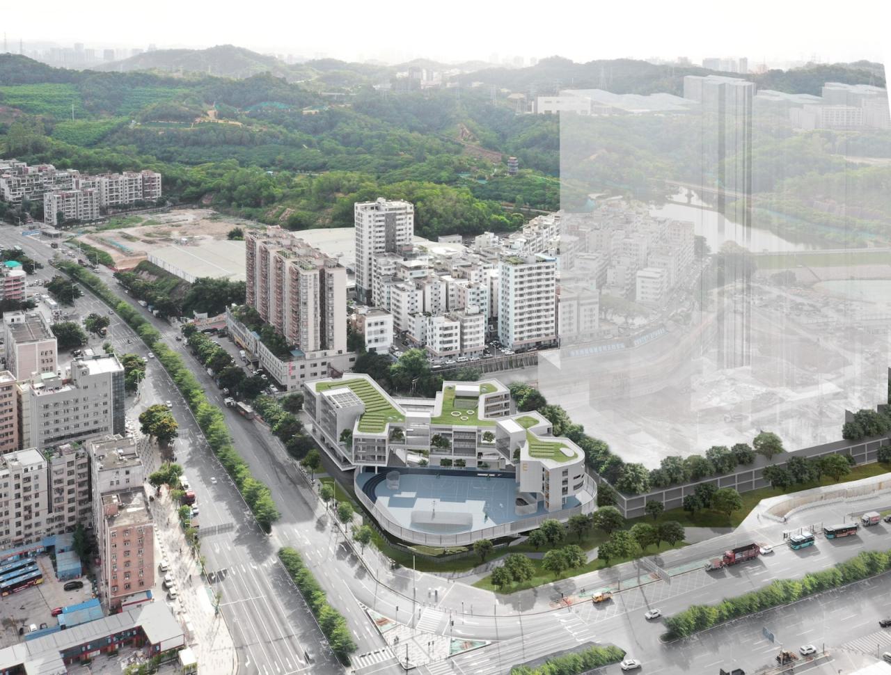 下雪村小学场地周围原为自然山体,自然地形在城市发展中被道路切割成高度不同的城市地块作为城中村、城市住宅和公共建筑,形成了独特的城市地理现状。本设计提案希望能够延续原有城市地理的高度关系,通过多重台地的方式组织高差关系,将城市景观带引入校园内部,营造校园和城市的资源共享面,在延续城市中原有自然山地体验的同时,创造出一个开放的校园边界。