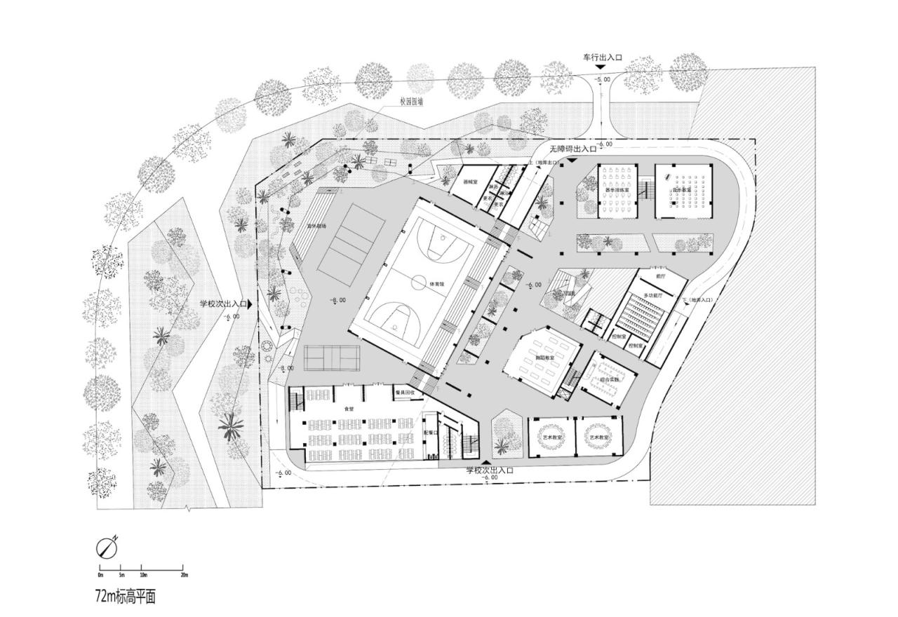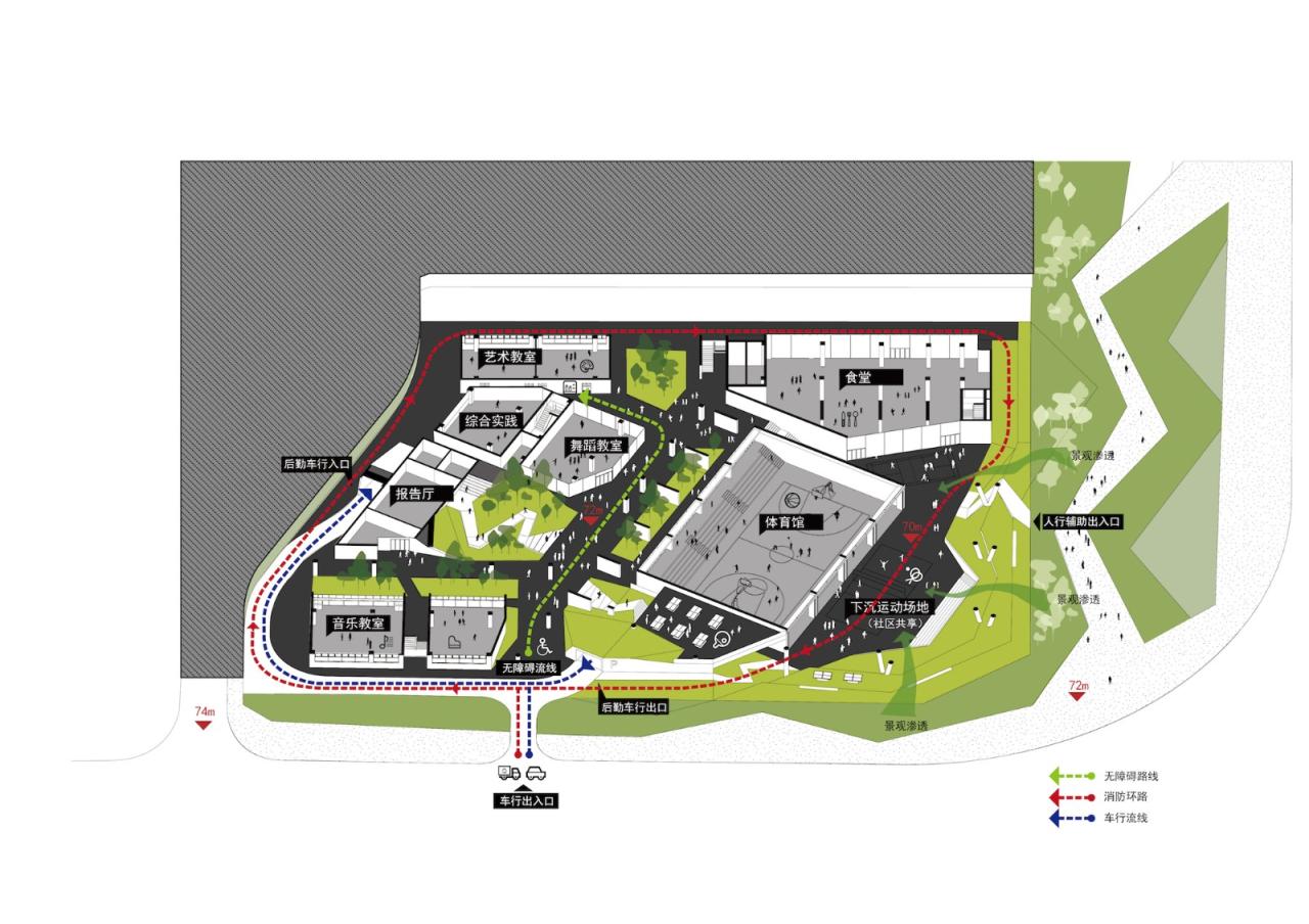 高密度校园的难点之一是如何创造丰富的校园活动空间。本设计在学校的地面层通过动静分区的方式设置了72M标高的下沉庭院教学区和70M标高运动场与景观场地。下沉庭院在本提案中作为校园活动空间的核心组织了艺术类教室、报告厅等等公共教学用房;在垂直方向,下沉庭院中的螺旋路径连接校园入口处的多层平台和地面层艺术教室;在水平路径上,下沉庭院也是师生们通往食堂和体育馆的中转空间。