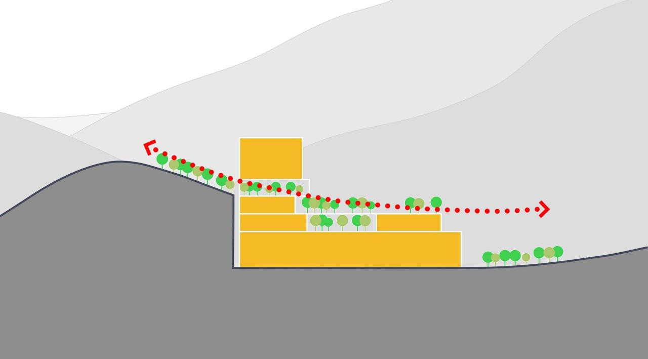 场所的自然性在本设计中,狭窄的用地里高容积率的建设需求,导致了建筑体量最后的呈现非高即宽,这种状态与场地所处的环境并不协调,因此,建筑与场地自然特征间的平衡成为了我们设计中最重要的挑战。受制于建筑功能的要求,完全融于自然的地景式建筑并不可行。我们提出了“复原山势 自然介入”的概念,在场地中用部分建筑体量复原被护坡打断的山势,将剩余的建筑体量以自然有机的方式介入其中。