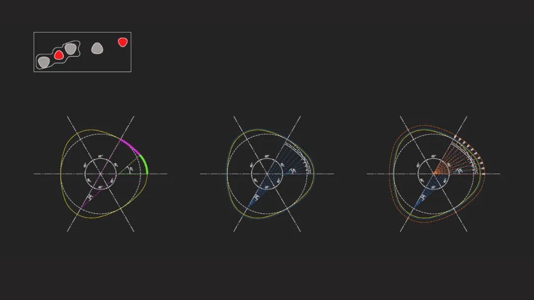 外格栅每60度为一组,每组包含S-1至S-10十种外格栅型号,通过反复镜像,实现‘兰花阁’的起伏形态
