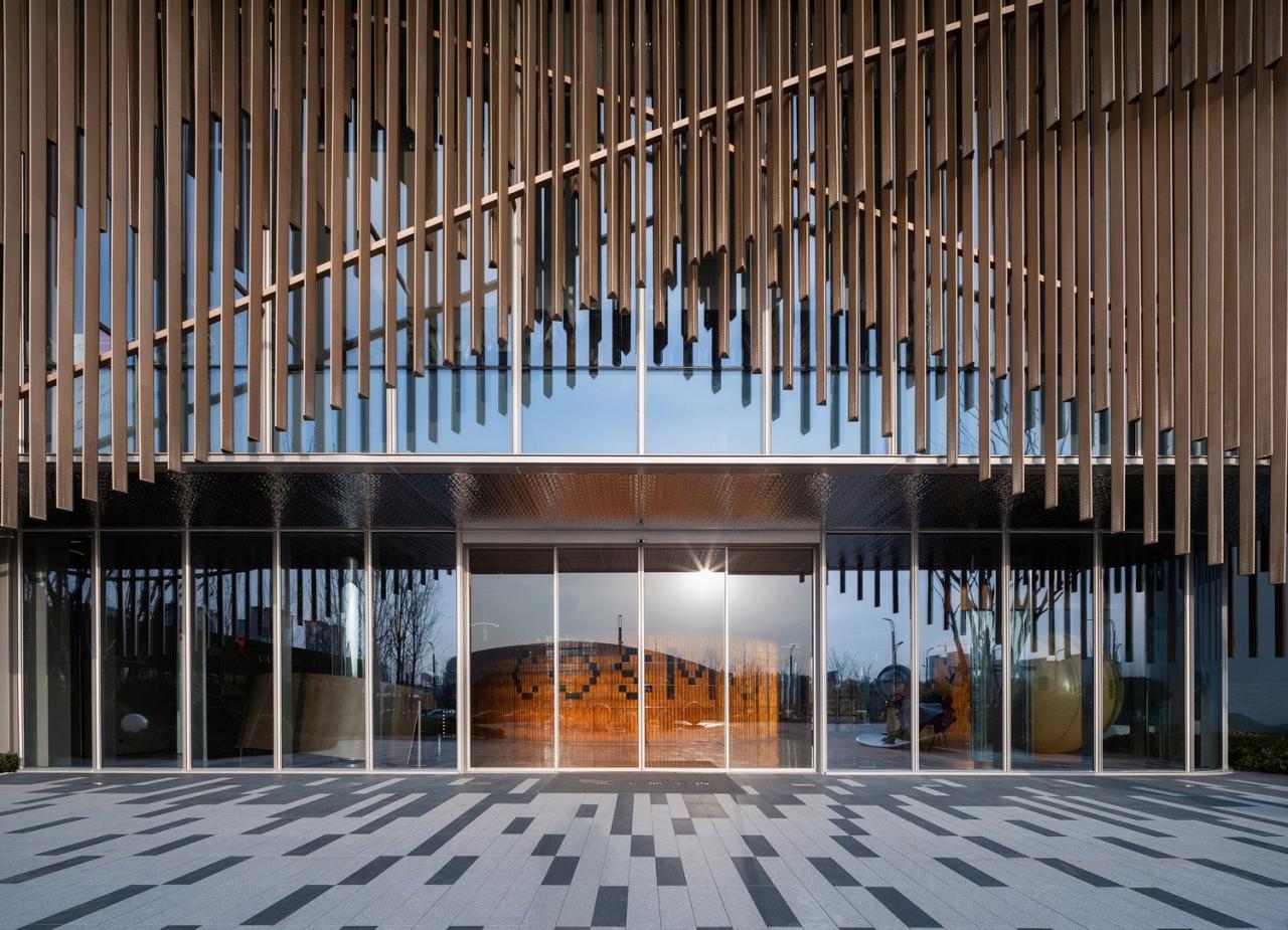 400根金属“幕帘”装置以最小的构件支撑,像一层漂浮在干净通透的主体建筑外的“面纱”,“幕帘”底部由渐变的穿孔铝板形成,当穿孔率超过50%后,铝板在视觉上失去了金属应有的质感,创造了朦胧不确定的视觉效果,如同剧场大幕一般。