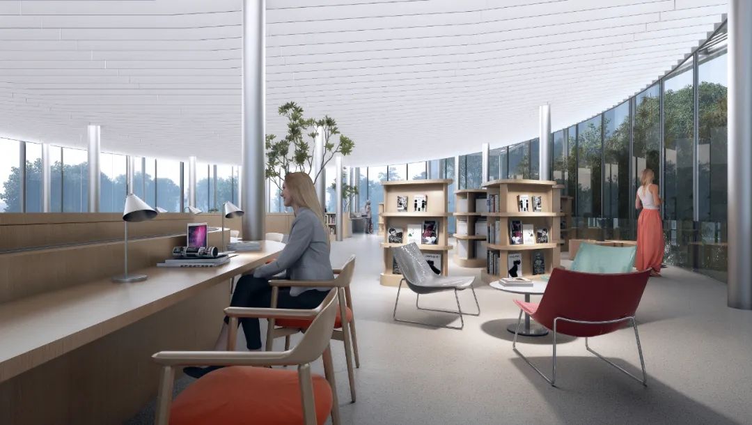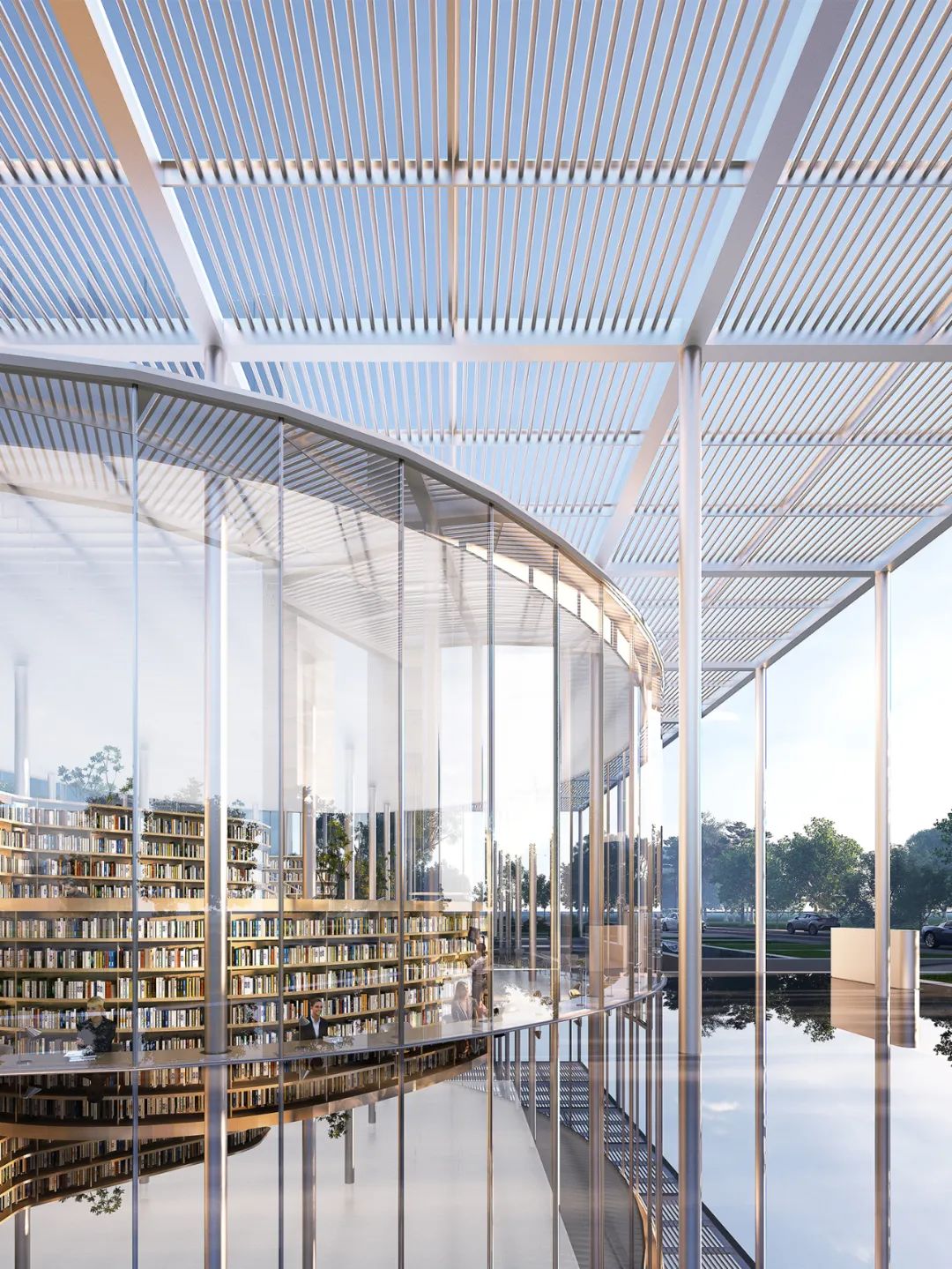 区别于传统图书馆的闭合空间,这座玻璃建筑将人们从封闭性中解放出来,将天、地、光、景引入室内,同时也将室内的场景展现无遗,让人们时刻感受着光影的变化与时间的流动。