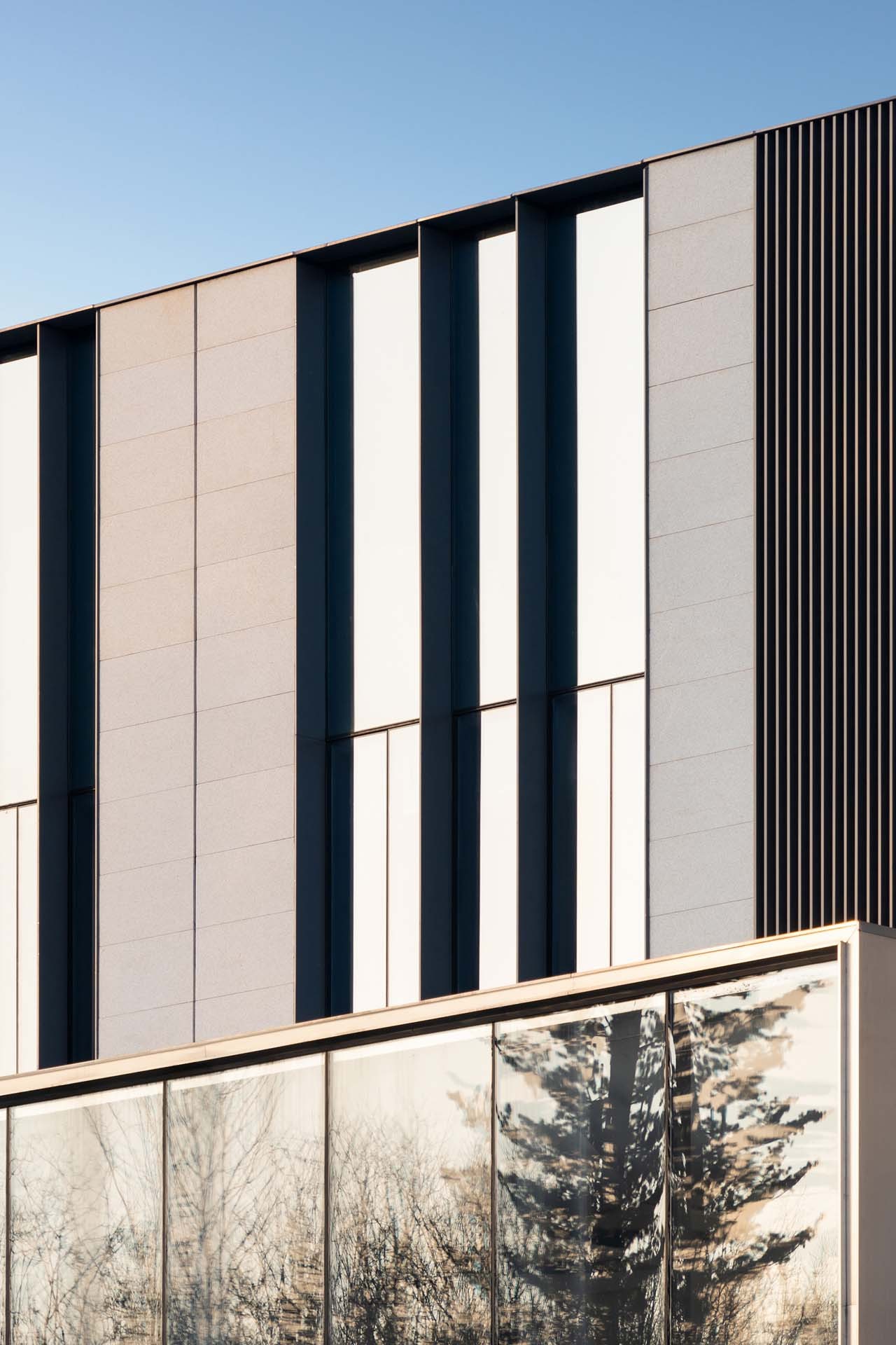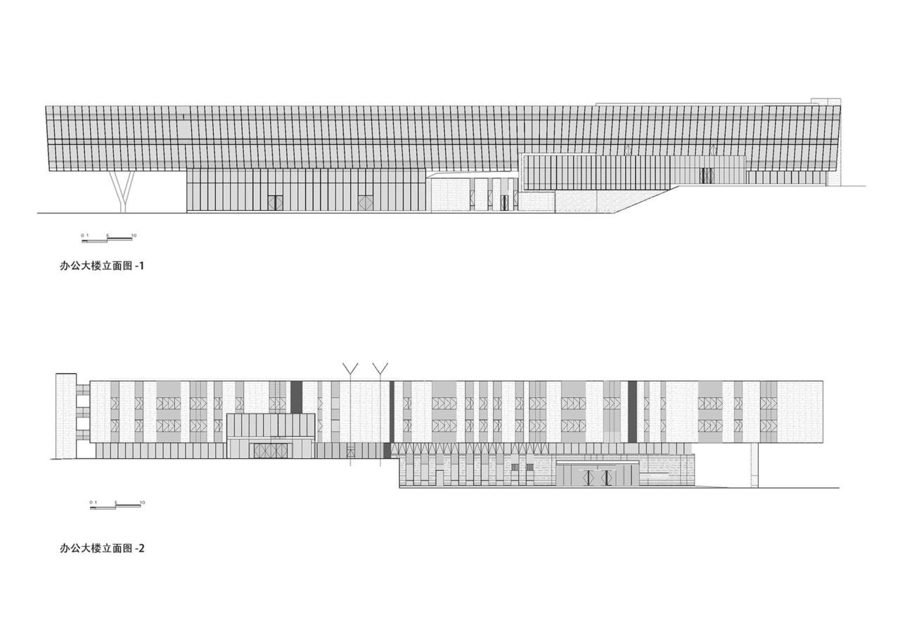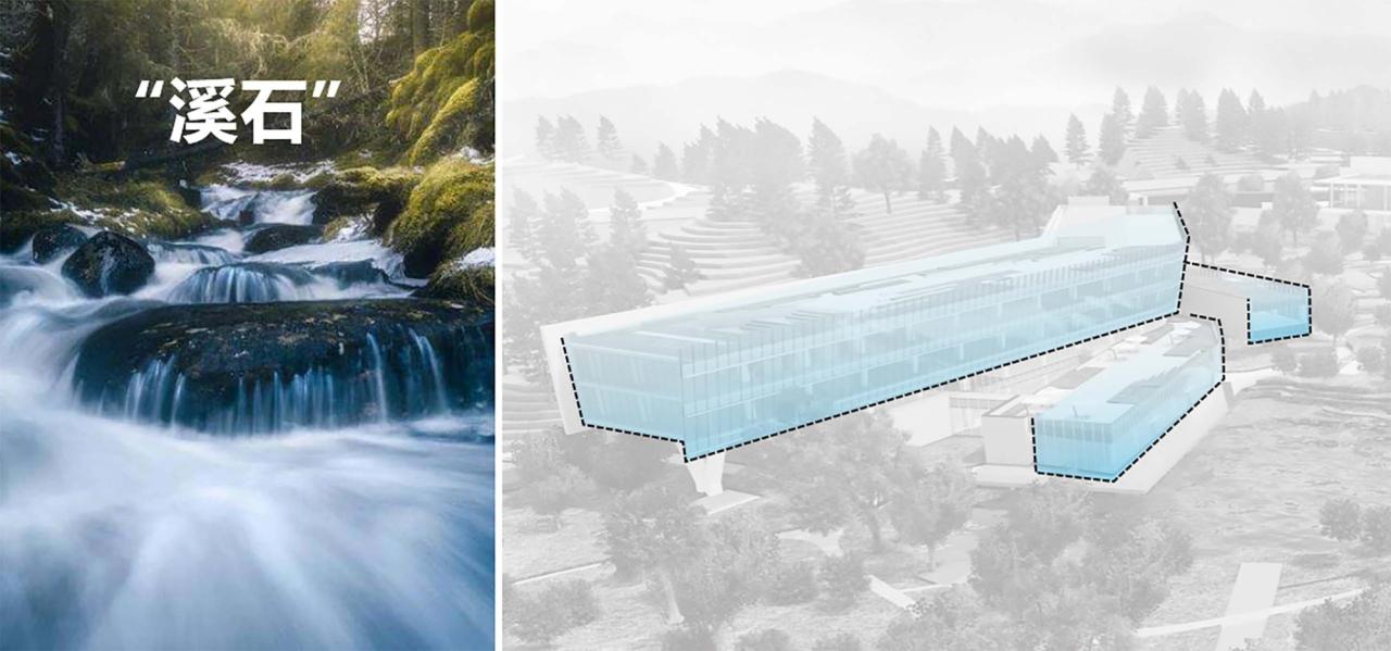 ‘’环境抽象‘’办公服务中心办公体量采用发散状的屋顶花园退台,丰富了‘’绿谷‘’的空间层次,同时也为内部的办公空间获取了开阔的景观视野,内侧立面借鉴山谷水涧和“溪石”意向,采用玻璃与石材大虚大实的结合来表达水石相间趣味性, 建筑外侧立面强调呼应两侧自然山林,从树林的空间关系图底抽象,提炼为虚实相间的韵律线条,与场地环境呼应。
