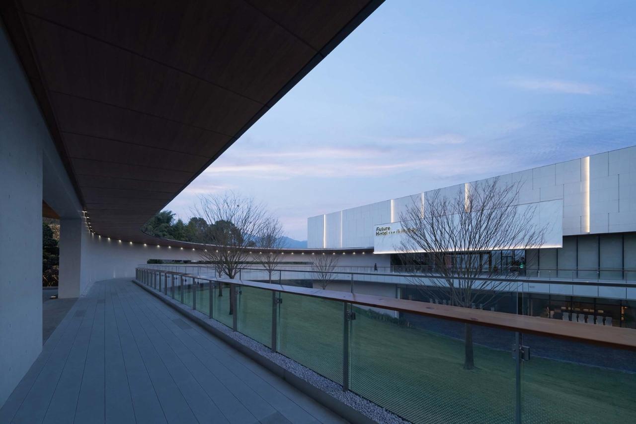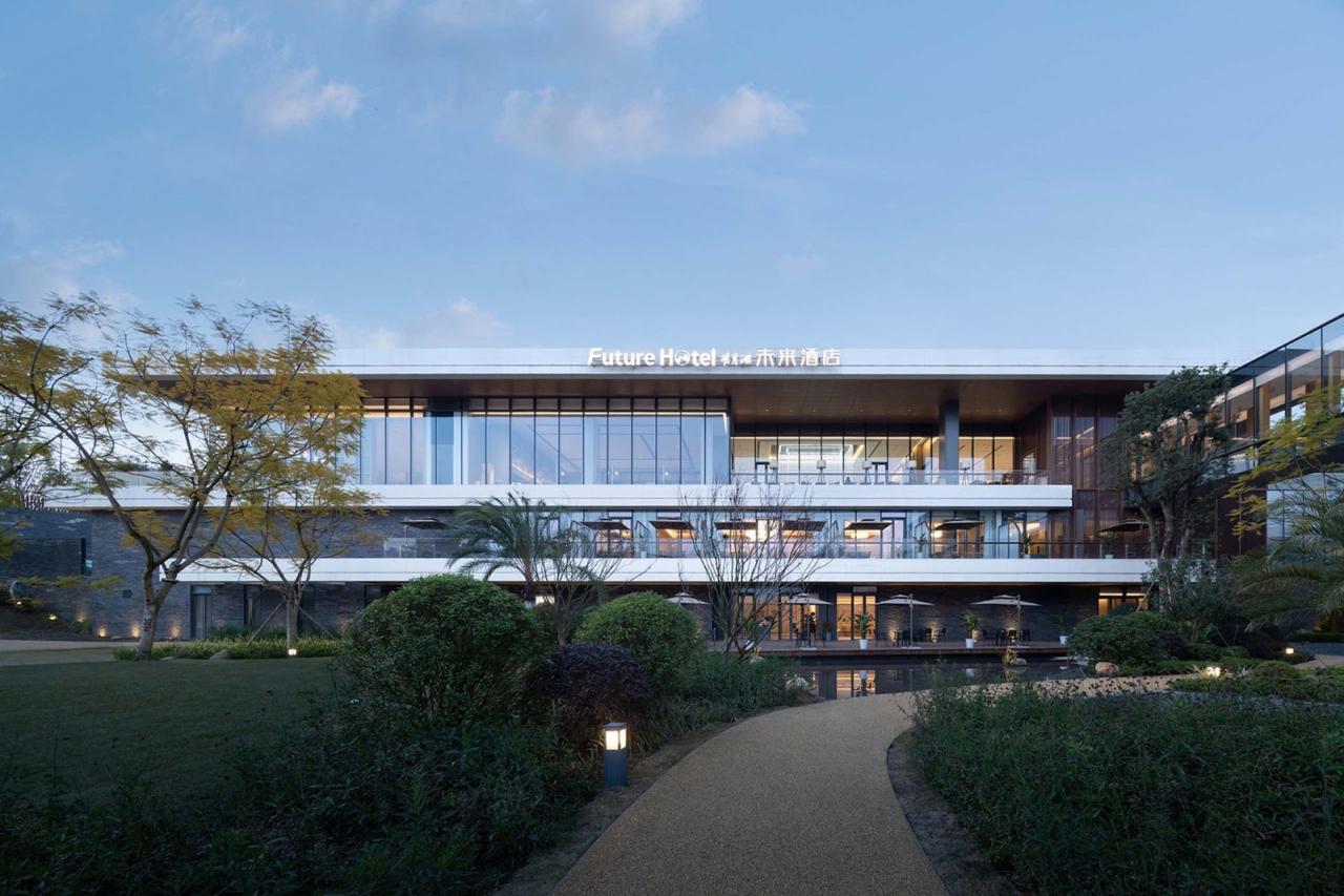酒店通过场地标高处理和路径的缓冲,规避来自城市的喧嚣噪音,入口通过U形廊桥勾勒简约而纯粹的空间形态,连续的横洞窗营造步移景异的景观体验,让人不知觉中悄然遁隐到这一片山野之中。客房体量与公区体量脱开处理,通过一段空中廊桥联系,丰富空间效果,立面通过楼板水平线条自由错动,赋予空间通透感和趣味性。